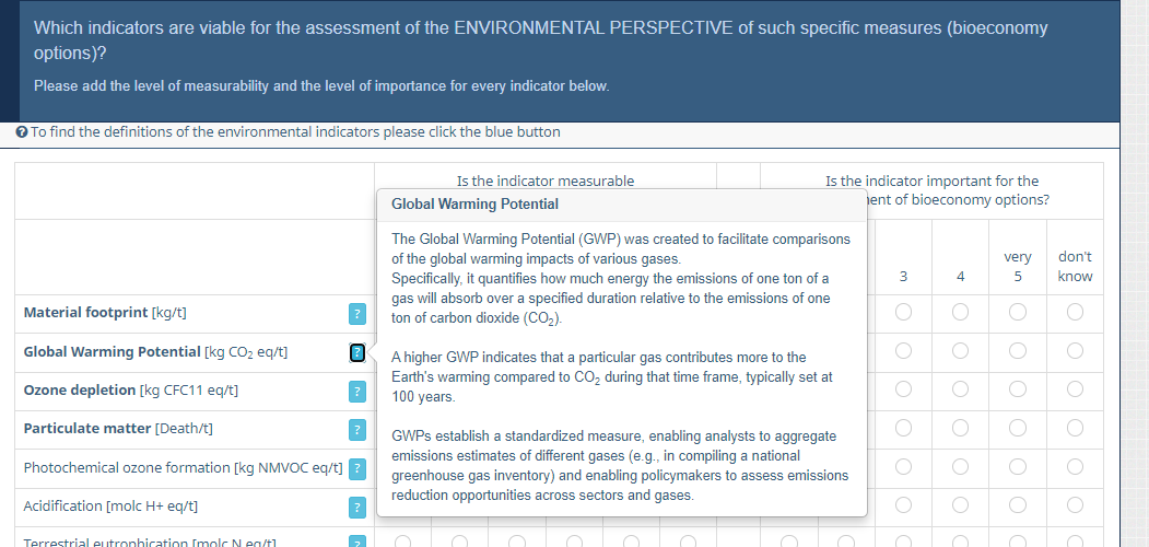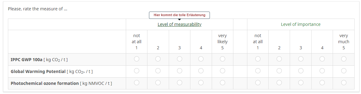 Ich kann es auf dem Bild nicht erkennen. Ist das auch ein Tooltip, oder willst Du einfach eine Zwischenüberschrift?Ist es möglich auch über den Indikatoren (Teilfragen), also z.B. Global Warming Potential, etwas zu ergänzen?