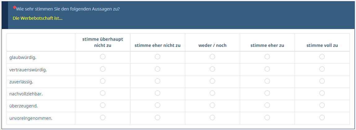 a. Bitte, gib allen Antwortoptionen einen Header. Es könnte sein, dass die Teilnehmer an ein schlecht programmiertes Etwas denken und daher nur die beiden Endwerte benutzen.