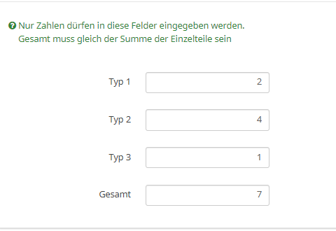Dann kannst Du natürlich validieren, dass der Wert in Teilfrage 4 gleich der Summe der ersten drei Teilfragen ist, also etwa so: