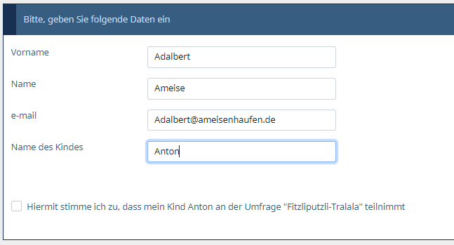 In diesem Fall ist es eine total offene Umfrage und Du musst ja in dieser nach Name, Anschrift, E-Mail und Name des Kindes fragen, für welches diese Einwilligung gilt; sonst ist die Einwilligung ja sinnlos.