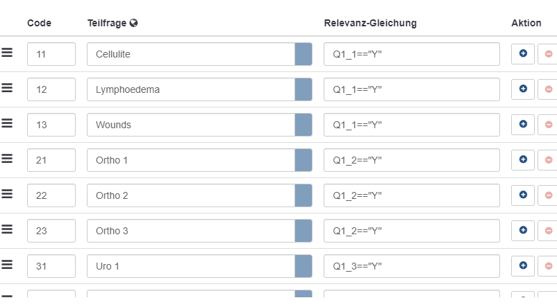2. Ich habe die drei verschiedenen Fragen zu einer zusammengefasst, und mittels Teilfragenrelevanz gefiltert.