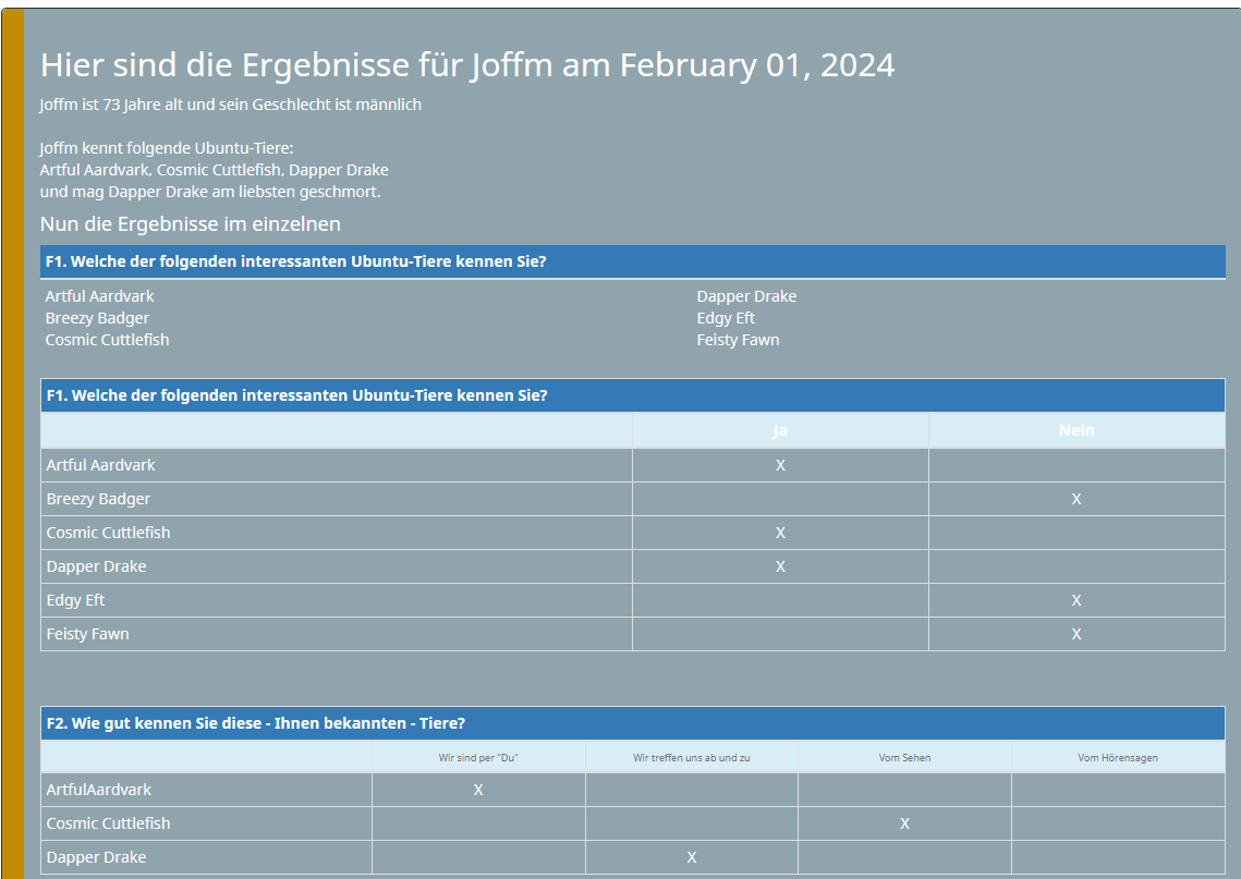 <h2>Hier sind die Ergebnisse für {F6a} am {date("F d, Y")}</h2> {F6a} ist {F6b} Jahre alt und {if(F6c==1,"sein",if(F6c==2,"ihr", "hat sein/ihr"))} Geschlecht {if(F6c==1,"ist männlich",if(F6c==2,"ist weiblich","leider nicht angegeben."))}<br /><br /> {F6a} kennt folgende Ubuntu-Tiere:<br />{list(that.F1.shown)}<br /> und mag {F3_1.shown} am liebsten {F4.shown}. <section id="Start"> <h4>Nun die Ergebnisse im einzelnen</h4> <table class="table table-condensed"> <thead> <tr> <th class="bg-primary" colspan="2">F1. Welche der folgenden interessanten Ubuntu-Tiere kennen Sie?</th> </tr> </thead> <tbody> <tr> <td class="text-left">{if(F1_SQ001=="Y","<checkbox-checked>","<checkbox>")} {F1_SQ001.question}<br />{if(F1_SQ002=="Y","<checkbox-checked>","<checkbox>")} {F1_SQ002.question}<br />{if(F1_SQ003=="Y","<checkbox-checked>","<checkbox>")} {F1_SQ003.question}</checkbox></checkbox-checked></checkbox></checkbox-checked></checkbox></checkbox-checked></td> <td class="text-left">{if(F1_SQ004=="Y","<checkbox-checked>","<checkbox>")} {F1_SQ004.question}<br />{if(F1_SQ005=="Y","<checkbox-checked>","<checkbox>")} {F1_SQ005.question}<br />{if(F1_SQ006=="Y","<checkbox-checked>","<checkbox>")} {F1_SQ006.question}</checkbox></checkbox-checked></checkbox></checkbox-checked></checkbox></checkbox-checked></td> </tr> </tbody> </table> <table class="table table-bordered table-condensed"> <thead> <tr> <th class="bg-primary" colspan="3">F1. Welche der folgenden interessanten Ubuntu-Tiere kennen Sie?</th> </tr> </thead> <thead> <tr> <th class="bg-info text-left" style="width:50%"> </th> <th class="bg-info text-center" style="width:25%" valign="middle">Ja</th> <th class="bg-info text-center" style="width:25%" valign="middle">Nein</th> </tr> </thead> <tbody> <tr> <td class="text-left">{F1_SQ001.question}</td> <td class="text-center">{if(F1_SQ001=="Y","X","")}</td> <td class="text-center">{if(F1_SQ001!="Y","X","")}</td> </tr> <tr> <td class="text-left">{F1_SQ002.question}</td> <td class="text-center">{if(F1_SQ002=="Y","X","")}</td> <td class="text-center">{if(F1_SQ002!="Y","X","")}</td> </tr> <tr> <td class="text-left">{F1_SQ003.question}</td> <td class="text-center">{if(F1_SQ003=="Y","X","")}</td> <td class="text-center">{if(F1_SQ003!="Y","X","")}</td> </tr> <tr> <td class="text-left">{F1_SQ004.question}</td> <td class="text-center">{if(F1_SQ004=="Y","X","")}</td> <td class="text-center">{if(F1_SQ004!="Y","X","")}</td> </tr> <tr> <td class="text-left">{F1_SQ005.question}</td> <td class="text-center">{if(F1_SQ005=="Y","X","")}</td> <td class="text-center">{if(F1_SQ005!="Y","X","")}</td> </tr> <tr> <td class="text-left">{F1_SQ006.question}</td> <td class="text-center">{if(F1_SQ006=="Y","X","")}</td> <td class="text-center">{if(F1_SQ006!="Y","X","")}</td> </tr> </tbody> </table> </section> <pagebreak> <section id="2.Teil" name="2.Teil">