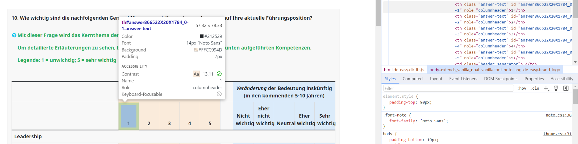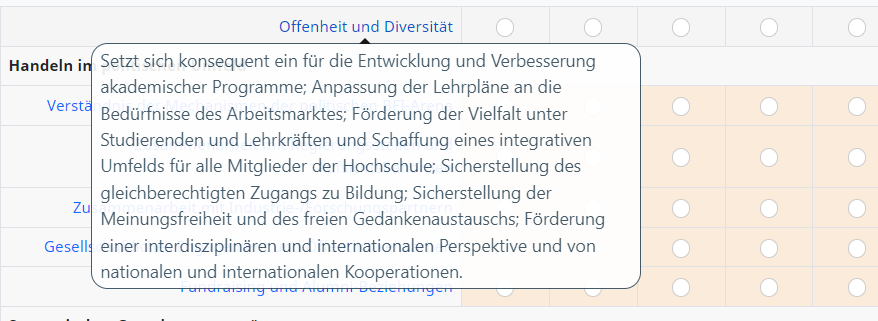 <script type="text/javascript" charset="utf-8"> $(document).on('ready pjax:scriptcomplete',function(){ $('.coloured-array.array-flexible-dual-scale').each(function(i) { // Assign column-specific classes $('table.subquestion-list tr.ls-heading:not(.groups)', this).each(function(i) { $('.answer-text', this).each(function(i){ $(this).addClass('column-'+(i+1)); }); }); }); }); </script><script type="text/javascript"> $(document).ready(function() { // Identify this question var thisQuestion = $('#question{QID}'); // Define the sub-heading text strings with tooltip text using the title attribute var subHeading1 = '<strong title="Your detailed information for Leadership">Leadership</strong>'; var subHeading2 = '<strong title="Your detailed information for Academic Environment">Handeln im akademischen Umfeld</strong>'; var subHeading3 = '<strong title="Your detailed information for Political Environment">Handeln im politischen Umfeld</strong>'; var subHeading4 = '<strong title="Your detailed information for Strategic Design">Strategisches Gestaltungsvermögen</strong>'; var subHeading5 = '<strong title="Your detailed information for Business Thinking">Betriebswirtschaftliches Denken und Handeln</strong>'; var subHeading6 = '<strong title="Your detailed information for Organizational Change">Den organisatorischen Wandel gestalten</strong>'; // Find out the number of columns in the question var columnsLength = $('tr.answers-list:eq(0) > *', thisQuestion).length; // Insert the subheadings before the specific subquestions $('tr.answers-list:eq(0)', thisQuestion).before('<tr class="sub-header-row"><th colspan="'+columnsLength+'">'+subHeading1+'</th></tr>'); $('tr.answers-list:eq(5)', thisQuestion).before('<tr class="sub-header-row"><th colspan="'+columnsLength+'">'+subHeading2+'</th></tr>'); $('tr.answers-list:eq(10)', thisQuestion).before('<tr class="sub-header-row"><th colspan="'+columnsLength+'">'+subHeading3+'</th></tr>'); $('tr.answers-list:eq(15)', thisQuestion).before('<tr class="sub-header-row"><th colspan="'+columnsLength+'">'+subHeading4+'</th></tr>'); $('tr.answers-list:eq(19)', thisQuestion).before('<tr class="sub-header-row"><th colspan="'+columnsLength+'">'+subHeading5+'</th></tr>'); $('tr.answers-list:eq(24)', thisQuestion).before('<tr class="sub-header-row"><th colspan="'+columnsLength+'">'+subHeading6+'</th></tr>'); // Fix the row classes for styling var rowClass = 1; $('table.subquestion-list tbody tr', thisQuestion).each(function(i) { if($(this).hasClass('sub-header-row')) { rowClass = 1; } else { rowClass++; $(this).removeClass('array1 array2'); if(rowClass % 2 == 0) { $(this).addClass('array2'); } else { $(this).addClass('array1'); } } }); // Initialize Bootstrap tooltips $('[data-bs-toggle="tooltip"]').tooltip(); }); </script>