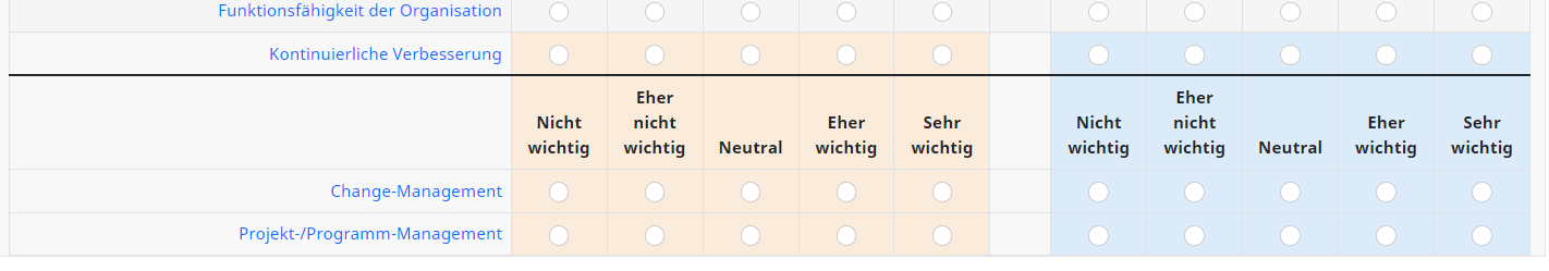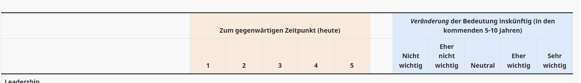 <p><strong>10. Wie wichtig sind die nachfolgenden General Management-Kompetenzen <u>bezogen auf Ihre aktuelle Führungsposition?</u></strong></p> <script type="text/javascript"> $(document).ready(function() { // Identify this question var thisQuestion = $('#question1784'); // Define the sub-heading text strings with tooltip text using the title attribute var subHeading1 = '<strong title="Your detailed information for Leadership">Leadership</strong>'; var subHeading2 = '<strong title="Your detailed information for Academic Environment">Handeln im akademischen Umfeld</strong>'; var subHeading3 = '<strong title="Your detailed information for Political Environment">Handeln im politischen Umfeld</strong>'; var subHeading4 = '<strong title="Your detailed information for Strategic Design">Strategisches Gestaltungsvermögen</strong>'; var subHeading5 = '<strong title="Your detailed information for Business Thinking">Betriebswirtschaftliches Denken und Handeln</strong>'; var subHeading6 = '<strong title="Your detailed information for Organizational Change">Den organisatorischen Wandel gestalten</strong>'; // Find out the number of columns in the question var columnsLength = $('tr.answers-list:eq(0) > *', thisQuestion).length; // Insert the subheadings before the specific subquestions $('tr.answers-list:eq(0)', thisQuestion).before('<tr class="sub-header-row"><th colspan="'+columnsLength+'">'+subHeading1+'</th></tr>'); $('tr.answers-list:eq(5)', thisQuestion).before('<tr class="sub-header-row"><th colspan="'+columnsLength+'">'+subHeading2+'</th></tr>'); $('tr.answers-list:eq(10)', thisQuestion).before('<tr class="sub-header-row"><th colspan="'+columnsLength+'">'+subHeading3+'</th></tr>'); $('tr.answers-list:eq(15)', thisQuestion).before('<tr class="sub-header-row"><th colspan="'+columnsLength+'">'+subHeading4+'</th></tr>'); $('tr.answers-list:eq(19)', thisQuestion).before('<tr class="sub-header-row"><th colspan="'+columnsLength+'">'+subHeading5+'</th></tr>'); $('tr.answers-list:eq(24)', thisQuestion).before('<tr class="sub-header-row"><th colspan="'+columnsLength+'">'+subHeading6+'</th></tr>'); // Fix the row classes for styling var rowClass = 1; $('table.subquestion-list tbody tr', thisQuestion).each(function(i) { if($(this).hasClass('sub-header-row')) { rowClass = 1; } else { rowClass++; $(this).removeClass('array1 array2'); if(rowClass % 2 == 0) { $(this).addClass('array2'); } else { $(this).addClass('array1'); } } }); // Initialize Bootstrap tooltips $('[data-bs-toggle="tooltip"]').tooltip(); }); </script><script> document.addEventListener("DOMContentLoaded", function() { // Target the specific question part for future importance with question ID 1903 var questionBaseId = "866522X20X1784"; // Base ID format in LimeSurvey might include the survey ID and question ID var questionPart = "1"; // Part 2 of the dual array, indicating future importance // Hide existing radio buttons for the second part of the question document.querySelectorAll('input[name^="' + questionBaseId + '#"]').forEach(function(radio) { radio.closest('td').style.display = 'none'; // Hide the table cell containing the radio button }); // Loop through each sub-question to add a slider document.querySelectorAll('[id^="javatbd' + questionBaseId + '"]').forEach(function(subQuestionRow) { var subQuestionId = subQuestionRow.id.match(/\d+$/)[0]; // Extract the numeric part (sub-question ID) // Create a new slider input var slider = document.createElement("input"); slider.setAttribute("type", "range"); slider.setAttribute("min", "-1"); // Assuming scale starts at 1 slider.setAttribute("max", "1"); // Assuming scale ends at 3, adjust as per your scale slider.setAttribute("value", "0"); // Default value, can be adjusted slider.setAttribute("step", "0.1"); // Set the step interval to 0.1 slider.setAttribute("class", "future-importance-slider"); // For styling if needed slider.setAttribute("id", questionBaseId + "_" + subQuestionId + "_slider"); // Find the cell where the slider should be placed var sliderCell = subQuestionRow.querySelector('td:last-child'); if (sliderCell) { // Clear the cell and append the slider to this cell sliderCell.innerHTML = ''; // This removes any existing content, like improperly placed sliders sliderCell.appendChild(slider); // Append the slider to the cell } // Update a hidden input or perform other actions when the slider value changes slider.addEventListener("input", function() { // Example: Update a hidden input field with the slider's value var hiddenInput = document.querySelector('input[id="java' + questionBaseId + subQuestionId + '_' + questionPart + '"]'); if(hiddenInput) { hiddenInput.value = this.value; } }); }); }); </script> <style type="text/css">.tooltip[data-toggle="tooltip"] { cursor: pointer; } /* Styles for your .mytooltip1 elements */ .mytooltip1 { cursor: pointer; font-weight: bold; color: #08407E; } .tooltip-inner{ min-width:500px; height:auto; padding:3px 8px; color:#314A5B; text-align:left; font-weight:400; border-radius:15px; border: 1px solid #314A5B; background-color:white; font-size: 16px; } .coloured-array.array-flexible-dual-scale .column-1 { background-color: rgba(255, 204, 153, 0.3);} .coloured-array.array-flexible-dual-scale .column-2 { background-color: rgba(255, 204, 153, 0.3);} .coloured-array.array-flexible-dual-scale .column-3 { background-color: rgba(255, 204, 153, 0.3);} .coloured-array.array-flexible-dual-scale .column-4 { background-color: rgba(255, 204, 153, 0.3);} .coloured-array.array-flexible-dual-scale .column-5 { background-color: rgba(255, 204, 153, 0.3);} .coloured-array.array-flexible-dual-scale .column-6 { background-color: rgba(153, 204, 255, 0.3);} .coloured-array.array-flexible-dual-scale .column-7 { background-color: rgba(153, 204, 255, 0.3);} .coloured-array.array-flexible-dual-scale .column-8 { background-color: rgba(153, 204, 255, 0.3);} .coloured-array.array-flexible-dual-scale .column-9 { background-color: rgba(153, 204, 255, 0.3);} .coloured-array.arra