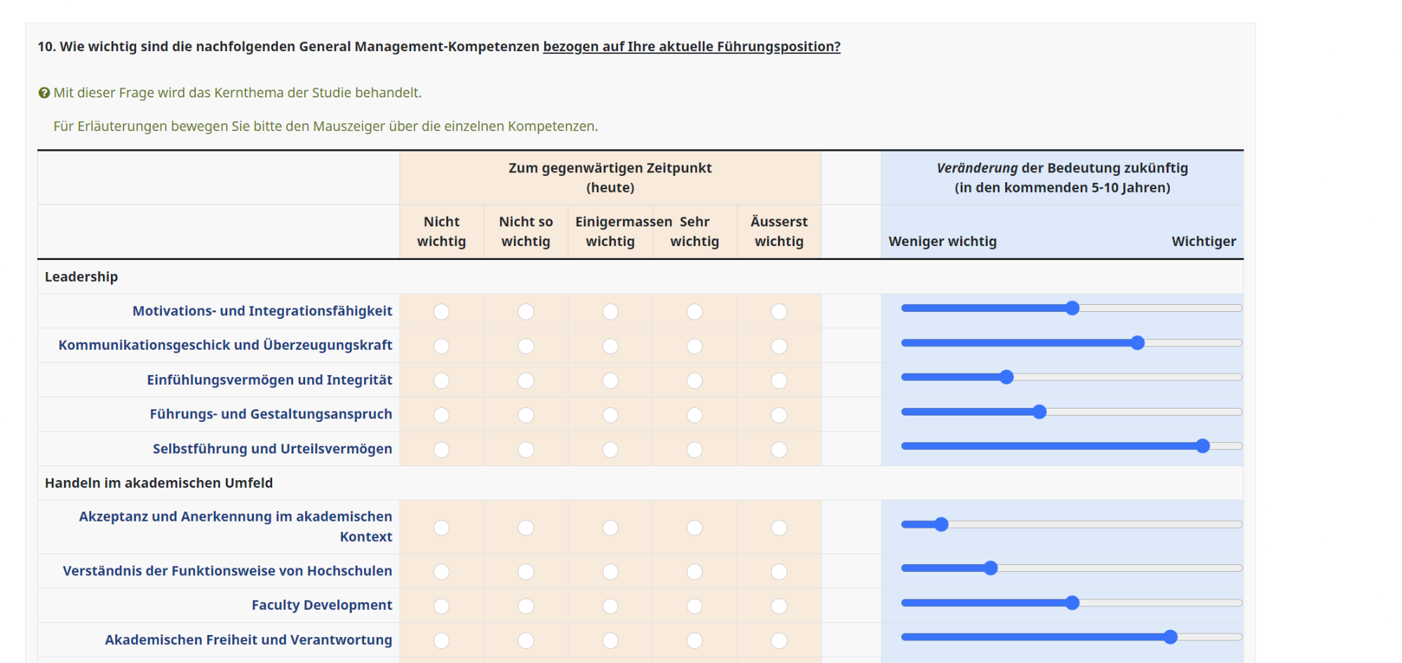 <p><strong>10. Wie wichtig sind die nachfolgenden General Management-Kompetenzen <u>bezogen auf Ihre aktuelle Führungsposition?</u></strong></p> <script type="text/javascript"> $(document).ready(function() { // Identify this question var thisQuestion = $('#question1784'); // Define the sub-heading text strings with tooltip text using the title attribute var subHeading1 = '<strong title="Your detailed information for Leadership">Leadership</strong>'; var subHeading2 = '<strong title="Your detailed information for Academic Environment">Handeln im akademischen Umfeld</strong>'; var subHeading3 = '<strong title="Your detailed information for Political Environment">Handeln im politischen Umfeld</strong>'; var subHeading4 = '<strong title="Your detailed information for Strategic Design">Strategisches Gestaltungsvermögen</strong>'; var subHeading5 = '<strong title="Your detailed information for Business Thinking">Betriebswirtschaftliches Denken und Handeln</strong>'; var subHeading6 = '<strong title="Your detailed information for Organizational Change">Den organisatorischen Wandel gestalten</strong>'; // Find out the number of columns in the question var columnsLength = $('tr.answers-list:eq(0) > *', thisQuestion).length; // Insert the subheadings before the specific subquestions $('tr.answers-list:eq(0)', thisQuestion).before('<tr class="sub-header-row"><th colspan="'+columnsLength+'">'+subHeading1+'</th></tr>'); $('tr.answers-list:eq(5)', thisQuestion).before('<tr class="sub-header-row"><th colspan="'+columnsLength+'">'+subHeading2+'</th></tr>'); $('tr.answers-list:eq(10)', thisQuestion).before('<tr class="sub-header-row"><th colspan="'+columnsLength+'">'+subHeading3+'</th></tr>'); $('tr.answers-list:eq(15)', thisQuestion).before('<tr class="sub-header-row"><th colspan="'+columnsLength+'">'+subHeading4+'</th></tr>'); $('tr.answers-list:eq(19)', thisQuestion).before('<tr class="sub-header-row"><th colspan="'+columnsLength+'">'+subHeading5+'</th></tr>'); $('tr.answers-list:eq(24)', thisQuestion).before('<tr class="sub-header-row"><th colspan="'+columnsLength+'">'+subHeading6+'</th></tr>'); // Fix the row classes for styling var rowClass = 1; $('table.subquestion-list tbody tr', thisQuestion).each(function(i) { if($(this).hasClass('sub-header-row')) { rowClass = 1; } else { rowClass++; $(this).removeClass('array1 array2'); if(rowClass % 2 == 0) { $(this).addClass('array2'); } else { $(this).addClass('array1'); } } }); // Initialize Bootstrap tooltips $('[data-bs-toggle="tooltip"]').tooltip(); }); </script><script> document.addEventListener("DOMContentLoaded", function() { // Target the specific question part for future importance with question ID 1903 var questionBaseId = "866522X20X1784"; // Base ID format in LimeSurvey might include the survey ID and question ID var questionPart = "1"; // Part 2 of the dual array, indicating future importance // Hide existing radio buttons for the second part of the question document.querySelectorAll('input[name^="' + questionBaseId + '#"]').forEach(function(radio) { radio.closest('td').style.display = 'none'; // Hide the table cell containing the radio button }); // Loop through each sub-question to add a slider document.querySelectorAll('[id^="javatbd' + questionBaseId + '"]').forEach(function(subQuestionRow) { var subQuestionId = subQuestionRow.id.match(/\d+$/)[0]; // Extract the numeric part (sub-question ID) // Create a new slider input var slider = document.createElement("input"); slider.setAttribute("type", "range"); slider.setAttribute("min", "-1"); // Assuming scale starts at 1 slider.setAttribute("max", "1"); // Assuming scale ends at 3, adjust as per your scale slider.setAttribute("value", "0"); // Default value, can be adjusted slider.setAttribute("step", "0.1"); // Set the step interval to 0.1 slider.setAttribute("class", "future-importance-slider"); // For styling if needed slider.setAttribute("id", questionBaseId + "_" + subQuestionId + "_slider"); // Find the cell where the slider should be placed var sliderCell = subQuestionRow.querySelector('td:last-child'); if (sliderCell) { // Clear the cell and append the slider to this cell sliderCell.innerHTML = ''; // This removes any existing content, like improperly placed sliders sliderCell.appendChild(slider); // Append the slider to the cell } // Update a hidden input or perform other actions when the slider value changes slider.addEventListener("input", function() { // Example: Update a hidden input field with the slider's value var hiddenInput = document.querySelector('input[id="java' + questionBaseId + subQuestionId + '_' + questionPart + '"]'); if(hiddenInput) { hiddenInput.value = this.value; } }); }); }); </script> <style type="text/css">.tooltip[data-toggle="tooltip"] { cursor: pointer; } /* Styles for your .mytooltip1 elements */ .mytooltip1 { cursor: pointer; font-weight: bold; color: #08407E; } .tooltip-inner{ min-width:500px; height:auto; padding:3px 8px; color:#314A5B; text-align:left; font-weight:400; border-radius:15px; border: 1px solid #314A5B; background-color:white; font-size: 16px; } .coloured-array.array-flexible-dual-scale .column-1 { background-color: rgba(255, 204, 153, 0.3);} .coloured-array.array-flexible-dual-scale .column-2 { background-color: rgba(255, 204, 153, 0.3);} .coloured-array.array-flexible-dual-scale .column-3 { background-color: rgba(255, 204, 153, 0.3);} .coloured-array.array-flexible-dual-scale .column-4 { background-color: rgba(255, 204, 153, 0.3);} .coloured-array.array-flexible-dual-scale .column-5 { background-color: rgba(255, 204, 153, 0.3);} .coloured-array.array-flexible-dual-scale .column-6 { background-color: rgba(153, 204, 255, 0.3);} .coloured-array.array-flexible-dual-scale .column-7 { background-color: rgba(153, 204, 255, 0.3);} .coloured-array.array-flexible-dual-scale .column-8 { background-color: rgba(153, 204, 255, 0.3);} .coloured-array.array-flexible-dual-scale .column-9 { background-color: rgba(153, 204, 255, 0.3);} .coloured-array.arra