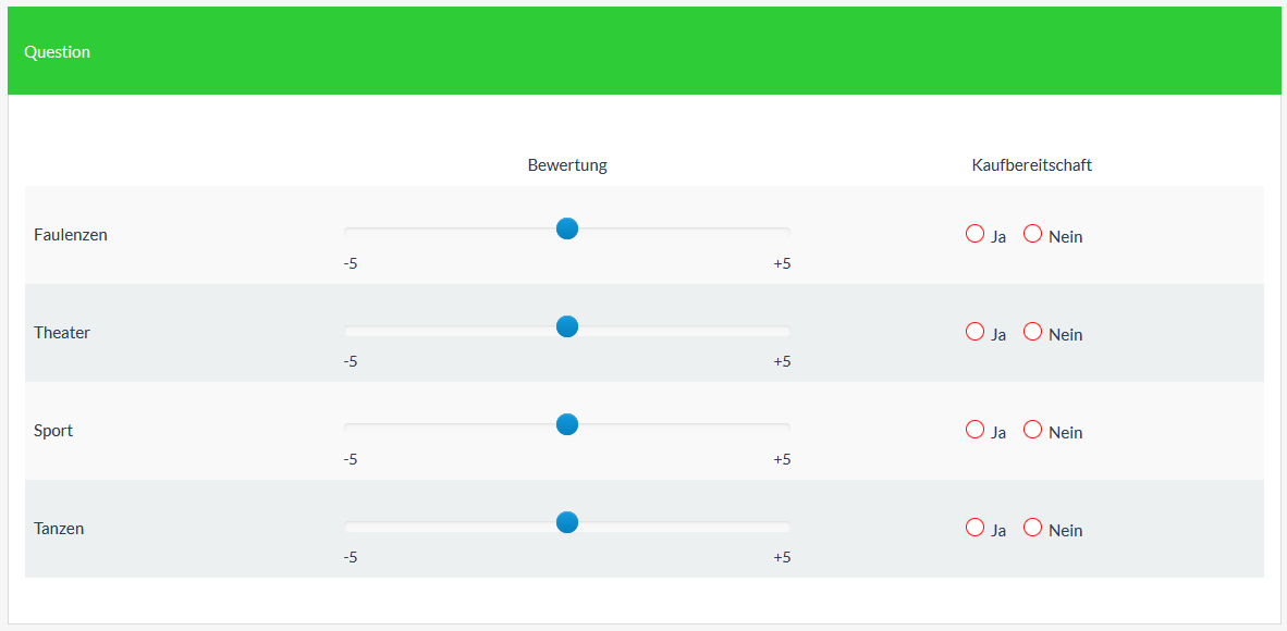 <script type="text/javascript" charset="utf-8"> $(document).ready(function(){ // Identify this question var thisQuestion = $('#question{QID}'); // Assign column-specific classes $('table.subquestion-list tr', thisQuestion).each(function(i) { $('> *:gt(0)', this).each(function(i){ $(this).addClass('column-'+(i+1)); $(this).attr('data-column', i+1); }); }); // Insert the sliders $('.answer-item.column-1 input[type="text"]', thisQuestion).each(function(i) { $(this).closest('td').addClass('with-slider'); var thisValue = $(this).val(); $(this).bootstrapSlider({ 'min': -5, 'max': 5, 'step': 0.1, 'range': false, 'value': Number(thisValue), 'tooltip': 'always' }); // Initialization stuff if(thisValue == '') { $(this).val(''); $(this).closest('td').find('.tooltip').hide(); } else { updateCallOut($(this).closest('td')); } }); // A function to update the slider callout function updateCallOut(el) { var thisTooltip = $(el).find('.tooltip'); //$('.tooltip-inner', thisTooltip).text(callOutText); thisTooltip.show().css('margin-left', '-'+(thisTooltip.width()/2)+'px'); } // Listener on sliders $('td.with-slider .slider').on('mousedown', function(event, ui) { updateCallOut($(this).closest('td')); }); $('td.with-slider input[type="text"]', thisQuestion).on('slide slideStop', function(event, ui) { updateCallOut($(this).closest('td')); checkconditions($(this).val(), $(this).attr('name'), 'text'); }); // Listener on resizing (override the bootstrap callout behaviour) $(window).resize(function() { $('td.with-slider', thisQuestion).each(function(i) { if($('input[type="text"]', this).val() != '') { updateCallOut(this); } }); }); // Define the slider left/right labels var sliderLeftLabels = ['-5', '-5','-5','-5','-5']; var sliderRightLabels = ['+5', '+5', '+5', '+5', '+5']; // Insert slider left/right labels $('td.with-slider', thisQuestion).append('<div class="left-text"></div><div class="right-text"></div>'); $('.left-text', thisQuestion).each(function(i) { $(this).text(sliderLeftLabels[i]); }); $('.right-text', thisQuestion).each(function(i) { $(this).text(sliderRightLabels[i]); }); // Some clean-up styles for the sliders (could be placed in template.css) $('thead th, .answer-item.column-1', thisQuestion).css({ 'text-align': 'center' }); $('.slider.slider-horizontal', thisQuestion).css({ 'margin': '1.7em auto 1em' }); $('.slider-selection', thisQuestion).css({ 'background': 'transparent none', 'box-shadow': 'none' }); $('.slider-handle', thisQuestion).css({ 'top': '-4px' }); $('.left-text, .right-text', thisQuestion).css({ 'margin-top': '-0.5em', 'font-size': '90%' }); $('.left-text', thisQuestion).css({ 'float': 'left' }); $('.right-text', thisQuestion).css({ 'float': 'right' }); // Hide the text inputs in columns 2 $('.column-2 input[type="text"]', thisQuestion).hide(); // Loop through all column-2 inputs $('.answer-item.column-2 input[type="text"]', thisQuestion).each(function(i) { var thisID = $(this).attr('id'); var thisValue = $(this).val(); // Insert the radios $(this).parent().addClass('radio').append('<span class="inserted-radio-wrapper">\ <input id="'+thisID+'-Y" class="radio" value="Y" name="'+thisID.replace(/answer/, '')+'_radio" type="radio">\ <label class="control-label radio-label" for="'+thisID+'-Y">Ja</label>\ </span>\ <span class="inserted-radio-wrapper">\ <input id="'+thisID+'-N" class="radio" value="N" name="'+thisID.replace(/answer/, '')+'_radio" type="radio">\ <label class="control-label radio-label" for="'+thisID+'-N">Nein</label>\ </span>'); // Initial radio states $(this).closest('td').find('input[type="radio"][value="'+thisValue+'"]').prop('checked', true); }); // Listener on the radios $('.answer-item.column-2 input[type="radio"]', thisQuestion).on('click', function() { var thisInput = $(this).closest('td').find('input[type="text"]'); $(this).closest('td').find('input[type="text"]').val($(this).val()); checkconditions($(thisInput).val(), $(thisInput).attr('name'), 'text'); }); // Some clean-up styles for the radios (could be placed in template.css) $('thead th, .answer-item.column-2', thisQuestion).css({ 'text-align': 'center' }); $('.answer-item.column-2 .inserted-radio-wrapper', thisQuestion).css({ 'display': 'inline-block', 'margin': '25px 10px 0 20px' }); $('.answer-item.column-2 label', thisQuestion).css({ 'padding': '0' }); $('.answer-item.column-2 .radio-label', thisQuestion).css({ 'padding-left': '3px', 'margin-right': '3px' }); // Randomize the array rows function shuffleArray(array) { for (var i = array.length - 1; i > 0; i--) { var j = Math.floor(Math.random() * (i + 1)); var temp = array[i]; array[i] = array[j]; array[j] = temp; } return array; } var tr = $('tr.subquestion-list', thisQuestion).detach().toArray(); shuffleArray(tr); $.each(tr, function(i, el) { $('table.subquestion-list tbody', thisQuestion).first().append(el); }); // Fix up the row background colours var rowIndex = 0; $('table.subquestion-list tbody tr', thisQuestion).each(function(i){ rowIndex ++; $(this).removeClass('array1, array2'); if(rowIndex % 2 == 0) { $(this).addClass('array1'); } else { $(this).addClass('array2'); } }); }); </script