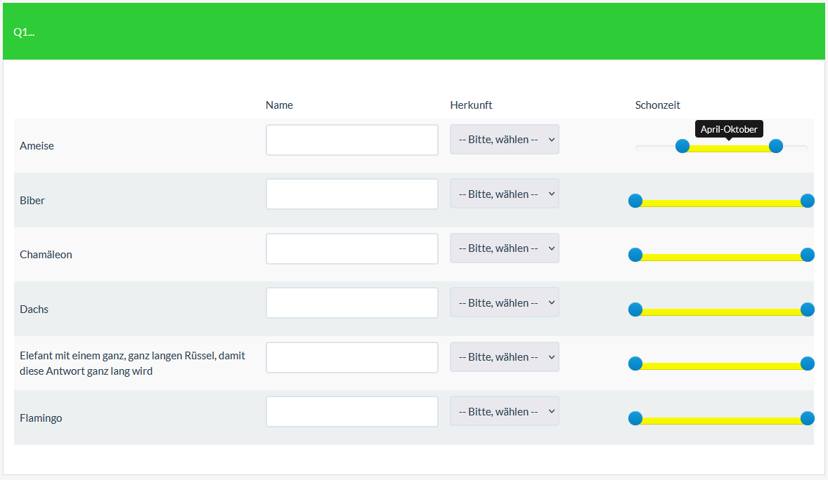 <script type="text/javascript" charset="utf-8"> $(document).ready(function(){ // Identify this question var thisQuestion = $('#question{QID}'); // Assign column-specific classes $('table.subquestion-list tr', thisQuestion).each(function(i) { $('> *:gt(0)', this).each(function(i){ $(this).addClass('column-'+(i+1)); $(this).attr('data-column', i+1); }); }); // Hide the text inputs in columns 2 $('.column-2 input[type="text"]', thisQuestion).hide(); // Define the select element (dropdown) var select1 = '<select class="inserted-select"> \ <option value="">-- Bitte, wählen --</option> \ <option value="Europa">Europa</option> \ <option value="Afrika">Afrika</option> \ <option value="Asien">Asien</option> \ <option value="Amerika">Amerika</option> \ <option value="Australien">Australien</option> \ </select>'; // Insert the select elements into column 2 $('.answer-item.column-2').append(select1); // Initial dropdown values in column 2 (if the question has already been answered) $('.answer-item.column-2 input[type="text"]').each(function(i){ if($.trim($(this).val()) != '') { $(this).closest('td').find('.inserted-select').val($.trim($(this).val())); } }); // Listener on the dropdowns (insert selected values into hidden text input) $('.inserted-select').change(function() { var thisInput = $(this).closest('td').find('input[type="text"]'); $(thisInput).val($(this).val()); checkconditions($(thisInput).val(), $(thisInput).attr('name'), 'text'); }); // Insert the sliders $('.answer-item.column-3 input[type="text"]', thisQuestion).each(function(i) { $(this).closest('td').addClass('with-slider'); var thisValue = $(this).val(); var thisValueArr = thisValue.split(','); var sliderValues = []; if(thisValueArr.length > 1) { $(thisValueArr).each(function(i) { sliderValues.push(Number(this)); }); } else { sliderValues = [1, 12]; } $(this).bootstrapSlider({ 'min': 1, 'max': 12, 'step': 1, 'range': true, 'value': sliderValues, 'tooltip': 'always' }); // Initialization stuff if(thisValue == '') { $(this).val(''); $(this).closest('td').find('.tooltip').hide(); } else { updateCallOut($(this).closest('td')); } }); // A function to insert months in the slider callout function updateCallOut(el) { var thisTooltip = $(el).find('.tooltip'); var thisValueArr = $(el).find('input[type="text"]').val().split(','); var months = { 1: 'Januar', 2: 'Februar', 3: 'März', 4: 'April', 5: 'Mai', 6: 'Juni', 7: 'Juli', 8: 'August', 9: 'September', 10: 'Oktober', 11: 'November', 12: 'Dezember' }; var startMonth = months[thisValueArr[0]]; var endMonth = months[thisValueArr[1]]; var callOutText = startMonth; if(startMonth != endMonth) { callOutText = startMonth+'-'+endMonth; } $('.tooltip-inner', thisTooltip).text(callOutText); thisTooltip.show().css('margin-left', '-'+(thisTooltip.width()/2)+'px'); } // Listener on sliders $('td.with-slider .slider').on('mousedown', function(event, ui) { updateCallOut($(this).closest('td')); }); $('td.with-slider input[type="text"]', thisQuestion).on('slide slideStop', function(event, ui) { updateCallOut($(this).closest('td')); checkconditions($(this).val(), $(this).attr('name'), 'text'); }); // Listener on resizing (override the bootstrap callout behaviour) $(window).resize(function() { $('td.with-slider', thisQuestion).each(function(i) { if($('input[type="text"]', this).val() != '') { updateCallOut(this); } }); }); // Some clean-up styles (could be placed in template.css $('select', thisQuestion).css({ 'border': '2px solid #dce4ec', 'padding': '0.7em', 'border-radius': '4px' }); $('.slider.slider-horizontal', thisQuestion).css({ 'margin': '1.7em auto 1em' }); $('.slider-handle', thisQuestion).css({ 'top': '-4px' }); }); </script>