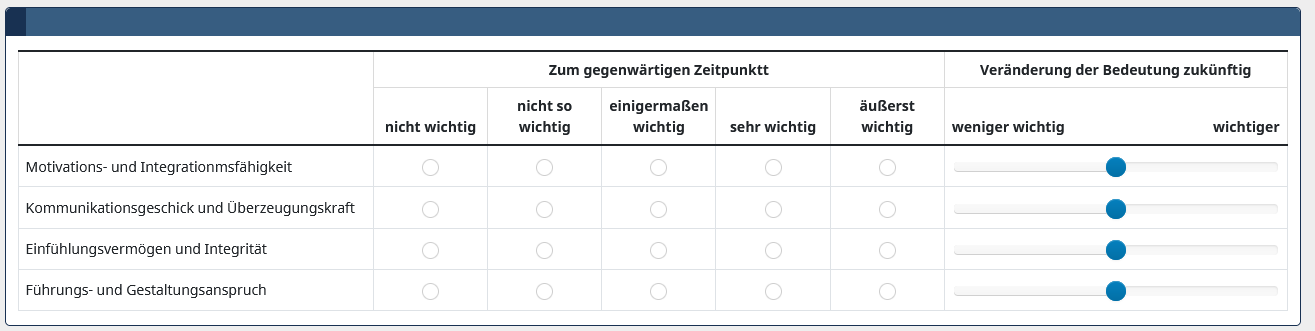 <p><strong>10. Wie wichtig sind die nachfolgenden General Management-Kompetenzen <u>bezogen auf Ihre aktuelle Führungsposition?</u></strong></p> <script type="text/javascript" charset="utf-8"> // Script zuum Einfügen der Checkboxen anstelle der Textfelder und Einstellen der Exclusivität $(document).on('ready pjax:scriptcomplete',function(){ // Identify this question var thisQuestion = $('#question{QID}'); // Column-specific classes $('tr.subquestion-list', thisQuestion).each(function(i) { $('th, td', this).each(function(i) { $(this).addClass('column-'+i); }); }); // Insert checkboxes $('.answer-item.column-1, .answer-item.column-2, .answer-item.column-3, .answer-item.column-4, .answer-item.column-5', thisQuestion).addClass('custom-checkbox-item'); $('.custom-checkbox-item', thisQuestion).each(function(i) { var thisID = $('input:text:eq(0)', this).attr('id'); $('label', this).before('<input class="" id="'+thisID+'" value="Y" type="checkbox" name="'+thisID.replace(/answer/, '')+'" />'); if($('input:text:eq(0)', this).val() == 'Y') { $('input:checkbox:eq(0)', this).prop('checked', true); } $(this).removeClass('text-item').addClass('checkbox-item'); $('input:text:eq(0)', this).remove(); }); // Identify exclusive items $('.answer-item.column-1, .answer-item.column-2, .answer-item.column-3, .answer-item.column-4, .answer-item.column-5', thisQuestion).addClass('exclusive-item'); // Listeners for exclusive items $('.non-exclusive-item input:checkbox', thisQuestion).on('change', function(e) { if($(this).is(':checked')) { $(this).closest('tr.subquestion-list').find('.exclusive-item input:checkbox').prop('checked', false); } }); $('.non-exclusive-item input:text', thisQuestion).on('keyup change', function(e) { if($.trim($(this).val()) != '') { $(this).closest('tr.subquestion-list').find('.exclusive-item input:checkbox').prop('checked', false); } }); $('.exclusive-item input:checkbox', thisQuestion).on('change', function(e) { if($(this).is(':checked')) { var thisItem = $(this).closest('.answer-item'); $(this).closest('tr.subquestion-list').find('.answer-item').not(thisItem).find('input:checkbox').prop('checked', false); $(this).closest('tr.subquestion-list').find('input:text').val(''); } }); }); </script><script type="text/javascript" data-author="Tony Partner"> // Script zum Einfügen der Slider in die 6. Spalte der Matrix $(document).on('ready pjax:scriptcomplete',function(){ // The column to receive the sliders var sliderColumn = 6; var thisQuestion = $('#question{QID}'); var nextQuestion = thisQuestion.nextAll('.numeric-multi:eq(0)'); // Hide the next question nextQuestion.hide(); //Remove the core array text inputs $('tr[id^="javatbd"] .answer-item:nth-child('+(sliderColumn+1)+') input', thisQuestion).remove(); // Wait for the sliders to be inititialized $('input:text', nextQuestion).on('slideEnabled',function(){ var thisItem = $(this).closest('li'); var thisItemIndex = thisItem.index(); // Move the slider and add some styling $('tr[id^="javatbd"]:eq('+thisItemIndex+') .answer-item:nth-child('+(sliderColumn+1)+')', thisQuestion).append($('.slider-container', thisItem)); $('tr[id^="javatbd"]:eq('+thisItemIndex+') .slider-container', thisQuestion) .removeClass('col-xs-12 col-sm-12') .css({ 'display': 'block', 'padding': '25px 10px 0 10px' }); }); }); </script><script type="text/javascript" charset="utf-8"> // Script zum Einfügen des zusätzlichen Headers $(document).on('ready pjax:scriptcomplete',function(){ // Insert the column categories $('#question{QID} table.subquestion-list thead tr:eq(0) td:eq(0)').remove(); $('#question{QID} table.subquestion-list thead').prepend('<tr class="ls-heading">\ <td rowspan="2" colspan="1" style="border-top:0 !important;"></td>\ <th class="answer-text inserted-header" colspan="5">Zum gegenwärtigen Zeitpunkt<br/>(heute)</th>\ <th class="answer-text inserted-header" colspan="1"><em>Veränderung</em> der Bedeutung zukünftig<br/>(in 5-10 Jahren)</th>\ </tr>'); }); </script><script type="text/javascript"> // Script zum Einfügen des Zwischenzeilen // Beachte: In dieser Matrix wird "subquestion-list" angesprochen, nicht "answers-list", wie in einer eindimensionalen Matrix $(document).ready(function() { // Identify this question var thisQuestion = $('#question{QID}'); // Define the sub-heading text strings with tooltip text using the title attribute var subHeading1 = '<strong title="Your detailed information for Leadership">Leadership</strong>'; var subHeading2 = '<strong title="Your detailed information for Academic Environment">Handeln im akademischen Umfeld</strong>'; var subHeading3 = '<strong title="Your detailed information for Political Environment">Handeln im politischen Umfeld</strong>'; var subHeading4 = '<strong title="Your detailed information for Strategic Design">Strategisches Gestaltungsvermögen</strong>'; var subHeading5 = '<strong title="Your detailed information for Business Thinking">Betriebswirtschaftliches Denken und Handeln</strong>'; var subHeading6 = '<strong title="Your detailed information for Organizational Change">Den organisatorischen Wandel gestalten</strong>'; // Find out the number of columns in the question var columnsLength = $('tr.subquestion-list:eq(0) > *', thisQuestion).length; // Insert the subheadings before the specific subquestions $('tr.subquestion-list:eq(0)', thisQuestion).before('<tr class="sub-header-row"><th colspan="'+columnsLength+'">'+subHeading1+'</th></tr>'); $('tr.subquestion-list:eq(5)', thisQuestion).before('<tr class="sub-header-row"><th colspan="'+columnsLength+'">'+subHeading2+'</th></tr>'); $('tr.subquestion-list:eq(10)', thisQuestion).before('<tr class="sub-header-row"><th colspan="'+columnsLength+'">'+subHeading3+'</th></tr>'); $('tr.subquestion-list:eq(15)', thisQuestion).before('<tr class="sub-header-row"><th colspan="'+columnsLength+'">'+subHeading4+'</th></tr>'); $('tr.subquestion-list:eq(19)', thisQuestion).before('<tr class="sub-header-row"><th colspan="'+columnsLength+'">'+subHeading5+'</th></t