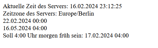 <?php $aktuelleZeit = date("d.m.Y H:i:s"); $serverZeitzone = date_default_timezone_get(); echo "Aktuelle Zeit des Servers: ".$aktuelleZeit."<br/>"; echo "Zeitzone des Servers: ".$serverZeitzone."<br/>"; echo date("d.m.Y H:i",mktime(0,0,0,2,22,2024)) . "<br>"; echo date("d.m.Y H:i",mktime(4,0,0,5,16,2024)) . "<br>"; $day = date("j"); $month = date("m"); $year = date("Y"); $newtime = mktime(4, 0, 0, $month, $day+1, $year); echo "Soll 4:00 Uhr morgen früh sein: ".date("d.m.Y H:i",$newtime); ?>