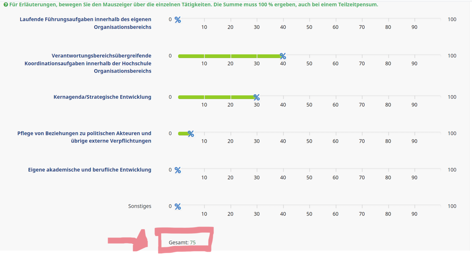 {if(sum(self.NAOK)!=100,'Die Summe muss 100 ergeben, auch bei einem Teilzeitpensum.<br/> <span style="color:black;font-size:14px">Im Moment haben Sie<span style="color:red;font-weight:bold"> '+sum(self.NAOK)+'</span> Punkte vergeben.</span>','<span style="color:green;font-size:14px">Sehr gut, Sie haben 100 Punkte verteilt</span>')}