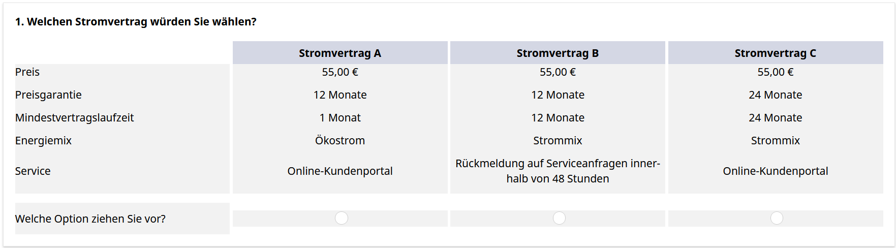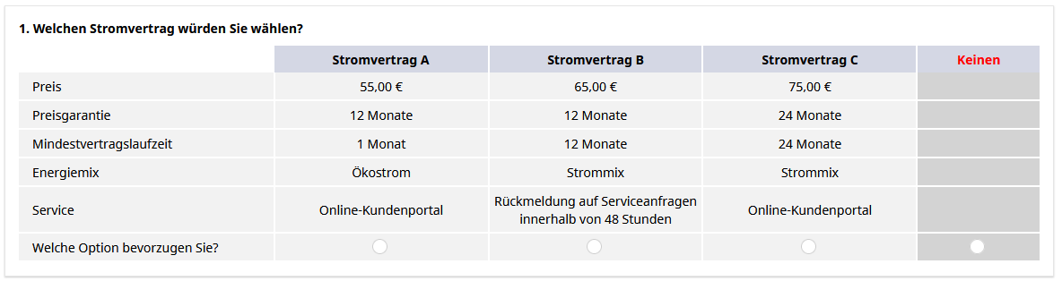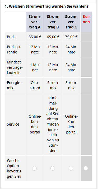 <table border="0" bordercolor="#ccc" cellpadding="5" cellspacing="0" style="border-collapse:collapse;"> <tbody> <tr> <td style="text-align: left;" width="25%"> </td> <td style="text-align: center;" width="0%"> </td> <td bgcolor="#D4D7E4" style="text-align: center;padding:5px" width="25%"><span style="font-size:14px;"><span style="color:#000000;"><b>Stromvertrag A</b></span></span></td> <td style="text-align: center;" width="0%"> </td> <td bgcolor="#D4D7E4" style="text-align: center;padding:5px" width="25%"><span style="font-size:14px;"><span style="color:#000000"><strong>Stromvertrag B</strong></span></span></td> <td style="text-align: center;" width="0%"> </td> <td bgcolor="#D4D7E4" style="text-align: center;padding:5px" width="25%"><span style="font-size:14px;"><span style="color:#000000"><b>Stromvertrag C</b></span></span></td> </tr> <tr> <td bgcolor="#f2f2f2" style="text-align: left;"> <p><span style="font-size:14px;"><span style="color:#000000;">Preis</span></span></p> </td> <td style="text-align: center;" width="0%"> <p> </p> </td> <td bgcolor="#f2f2f2" style="text-align: center;"> <p><font color="#000000"><span style="caret-color: rgb(0, 0, 0); font-size: 14px;">55,00 €</span></font></p> </td> <td style="text-align: center;" width="0%"> <p> </p> </td> <td bgcolor="#f2f2f2" style="text-align: center;"> <p><font color="#000000"><span style="caret-color: rgb(0, 0, 0); font-size: 14px;">55,00 €</span></font></p> </td> <td style="text-align: center;" width="0%"> <p> </p> </td> <td bgcolor="#f2f2f2" style="text-align: center;"> <p><span style="font-size:14px;"><span style="color:#000000;">55,00 €</span></span></p> </td> </tr> <tr> <td bgcolor="#f2f2f2" style="text-align: left;"> <p><span style="font-size:14px;"><span style="color:#000000;">Preisgarantie</span></span></p> </td> <td style="text-align: center;" width="0%"> <p> </p> </td> <td bgcolor="#f2f2f2" style="text-align: center;"> <p><span style="font-size:14px;"><span style="color:#000000;">12 Monate</span></span></p> </td> <td style="text-align: center;" width="0%"> <p> </p> </td> <td bgcolor="#f2f2f2" style="text-align: center;"> <p><span style="font-size:14px;"><span style="color:#000000;">12 Monate</span></span></p> </td> <td style="text-align: center;" width="0%"> <p> </p> </td> <td bgcolor="#f2f2f2" style="text-align: center;"> <p><span style="font-size:14px;"><span style="color:#000000;">24 Monate</span></span></p> </td> </tr> <tr> <td bgcolor="#f2f2f2" style="text-align: left;"> <p><span style="font-size:14px;"><span style="color:#000000;">Mindestvertragslaufzeit</span></span></p> </td> <td style="text-align: center;" width="0%"> <p> </p> </td> <td bgcolor="#f2f2f2" style="text-align: center;"> <p><span style="font-size:14px;"><span style="color:#000000;">1 Monat</span></span></p> </td> <td style="text-align: center;" width="0%"> <p> </p> </td> <td bgcolor="#f2f2f2" style="text-align: center;"> <p><span style="font-size:14px;"><span style="color:#000000;">12 Monate</span></span></p> </td> <td style="text-align: center;" width="0%"> <p> </p> </td> <td bgcolor="#f2f2f2" style="text-align: center;"> <p><span style="font-size:14px;"><span style="color:#000000;">24 Monate</span></span></p> </td> </tr> <tr> <td bgcolor="#f2f2f2" style="text-align: left;"> <p><span style="font-size:14px;"><span style="color:#000000;">Energiemix</span></span></p> </td> <td style="text-align: center;" width="0%"> <p> </p> </td> <td bgcolor="#f2f2f2" style="text-align: center;"> <p><font color="#000000"><span style="caret-color: rgb(0, 0, 0); font-size: 14px;">Ökostrom</span></font></p> </td> <td style="text-align: center;" width="0%"> <p> </p> </td> <td bgcolor="#f2f2f2" style="text-align: center;"> <p><font color="#000000"><span style="caret-color: rgb(0, 0, 0); font-size: 14px;">Strommix</span></font></p> </td> <td style="text-align: center;" width="0%"> <p> </p> </td> <td bgcolor="#f2f2f2" style="text-align: center;"> <p><font color="#000000"><span style="caret-color: rgb(0, 0, 0); font-size: 14px;">Strommix</span></font></p> </td> </tr> <tr> <td bgcolor="#f2f2f2" style="text-align: left;"> <p><span style="font-size:14px;"><span style="color:#000000;">Service</span></span></p> </td> <td style="text-align: center;" width="0%"> <p> </p> </td> <td bgcolor="#f2f2f2" style="text-align: center;"> <p><span style="font-size:14px;"><span style="color:#000000;">Online-Kundenportal</span></span></p> </td> <td style="text-align: center;" width="0%"> <p> </p> </td> <td bgcolor="#f2f2f2" style="text-align: center;"> <p><span style="font-size:14px;"><span style="color:#000000;">Rückmeldung auf Serviceanfragen innerhalb von 48 Stunden</span></span></p> </td> <td style="text-align: center;" width="0%"> <p> </p> </td> <td bgcolor="#f2f2f2" style="text-align: center;"> <p><span style="font-size:14px;"><span style="color:#000000;">Online-Kundenportal</span></span></p> </td> </tr> <tr style="height: 6px; text-align: center;"> </tr> <tr style="height: 6px; text-align: center;"> </tr> <tr> <td bgcolor="#f2f2f2" style="text-align: left;font-size:14px"><span style="color:#000000;">Welche Option ziehen Sie vor? </span></td> <td style="text-align: center;" width="0%"> </td> <td bgcolor="#f2f2f2" style="text-align: center;"> </td> <td style="text-align: center;" width="0%"> </td> <td bgcolor="#f2f2f2" style="text-align: center;"> </td> <td style="text-align: center;" width="0%"> </td> <td bgcolor="#f2f2f2"> </td> </tr> </tbody> </table> <script type="text/javascript" charset="utf-8"> $(document).on('ready pjax:scriptcomplete',function(){ // Identify this question var thisQuestion = $('#question{QID}'); // Move the radios $('.question-text table:eq(0) tr:last td:eq(2)', thisQuestion).append($('.subquestion-list .answers-list:eq(0) .answer-item:eq(0) *', thisQuestion)); $('.question-text table:eq(0) tr:last td:eq(4)', thisQuestion).append($('.subquestion-list .answers-list:eq(0) .answer-item:eq(1) *', thisQuestion)); $('.question-text table:eq(0) tr:last td:eq(6)', th