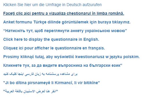 Das kann ja nur eine einzige Seite sein (sonst hättest Du ja wieder das Sprachproblem).Dazu habe ich in der ersten Umfrage eine Übersichtsseite erstellt, wo in verschiedenen Sprachen steht: "Klicken Sie hier, um die Umfrage in (Sprache) aufzurufen, mit einem Link dazu.
