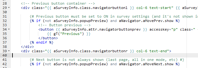 <div class="{{ aSurveyInfo.class.navigatorcontainer }} row navigator space-col" id="{{ aSurveyInfo.id.navigatorcontainer }}" {{ aSurveyInfo.attr.navigatorcontainer }}> <!-- Navigation buttons container --> <div class="col-3"></div> <div class="{{ aSurveyInfo.class.navigatorbuttonl }} col-3 text-start" {{ aSurveyInfo.attr.navigatorbuttonl }}> {# Previous button must be set to ON in survey settings (and it's not shown in first page, in All in One survey mode, etc) #} {% if (not aSurveyInfo.popupPreview) and aNavigator.aMovePrev.show %} <!-- Button previous --> <button {{ aSurveyInfo.attr.navigatorbuttonprev }} accesskey="p" class=" {{ aNavigator.disabled }} {{ aSurveyInfo.class.navigatorbuttonprev }} btn btn-lg btn-outline-secondary " > {{ gT("Previous") }} </button> {% endif %} </div> <div class="{{ aSurveyInfo.class.navigatorbuttonr }} col-3 text-end"> {# Next button is not always shown (last page, all in one mode, etc) #} {% if (not aSurveyInfo.popupPreview) and aNavigator.aMoveNext.show %} {# On last page, Next button become submit button. #} {% if (not aSurveyInfo.popupPreview) and aNavigator.aMoveNext.value == "movesubmit" %} {% if not empty(aSurveyInfo.mandViolation) and not empty(aSurveyInfo.mandSoft) and empty(aSurveyInfo.mandNonSoft) and aSurveyInfo.showPopups != 1 %} <span class="checkbox-item"> <input class="{{ aSurveyInfo.class.mandsoftcheckbox }}" type="checkbox" name="mandSoft" id="mandSoft" value="{{ aSurveyInfo.aNavigator.aMoveNext.value }}" /> <label for="mandSoft" class="control-label {{ aSurveyInfo.class.mandsoftcheckboxlabel }}">{{ gT("Continue without answering") }}</label> </span> {% endif %} <!-- Button submit --> <button {{ aSurveyInfo.attr.navigatorbuttonsubmit }} accesskey="n" class=" {{ aNavigator.disabled }} {{ aSurveyInfo.class.navigatorbuttonsubmit }} btn btn-lg btn-primary"> {{ gT("Submit") }} </button> {% else %} <!-- Button Next --> <button {{ aSurveyInfo.attr.navigatorbuttonnext }} accesskey="n" class=" {{ aNavigator.disabled }} {{ aSurveyInfo.class.navigatorbuttonnext }} btn btn-lg btn-primary " > {{ gT("Next") }} </button> {% endif %} {% endif %} </div> <div class="col-3"></div> </div>
