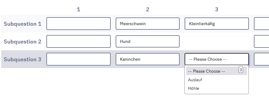 ==================Hallo,ich habe eine recht komplexe Matrix mit Klappboxen und Eingabefeldern. Nun stehe ich vor dem Problem, dass ich in Spalte 2 (Haltung) gerne eine eingeschränkte Auswahl hätte, die über Spalte 1 geregelt wird. Nun muss ich allerdings auch erwähnen, dass meine Umfrage eigentlich schon fast fertig war und sich diese Matrix (hier nur ein Beispiel) und mehrere weitere ähnliche in der Auswahl ändern sollen. Ich hatte eine Matrix gewählt, damit die Frage nicht so riesig wird.Ich habe schon die Variante eingeben, dass wenn man in Spalte 1 „Hund“ auswählt, die Klappbox in Spalte 2 ausgegraut wird. Eigentlich möchte ich es gerne so haben, wie im folgenden Schema. Ich weiß aber nicht, ob das möglich ist.Spalte 1: Meerschweinchen --> Auswahl in Spalte 2: Kleintierkäfig und AußenstallSpalte 1: Kaninchen --> Auswahl in Spalte 2: Auslauf und Höhle Spalte 1: Wellensittich oder Kanarienvogel --> Auswahl in Spalte 2: Vogelkäfig, Voliere und Freiflughalle =10.5ptSpalte 1: Hund --> Auswahl in Spalte 2: keine