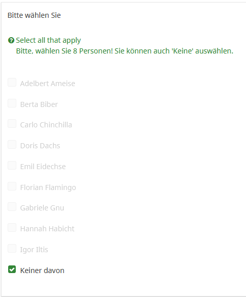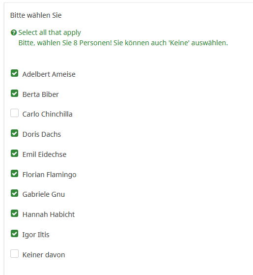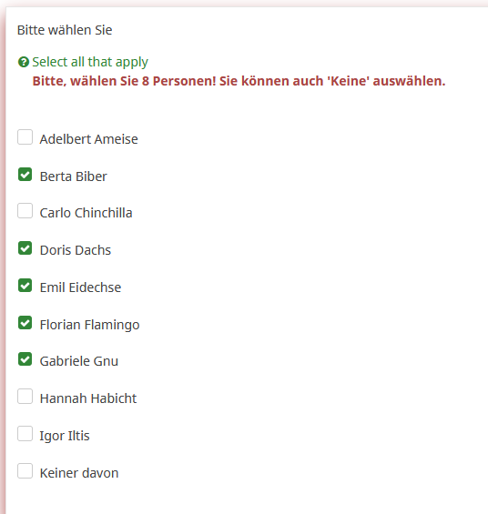 Fragenvalidierungsgleichung (em_validation_q)BeschreibungDies ist eine Gleichung, die verwendet wird, um die gesamte Frage zu validieren (z. B. alle ihre Teile zusammen für eine Frage mit mehreren Antworten). Wenn die Frage die Validierungskriterien nicht erfüllt, wird die Meldung em_validation_q_tip angezeigt (sie verwendet den CSS-Stil .error). Dieser Tipp verwendet den CSS-Stil .em_q_fn_validation, der standardmäßig in template.css ausgeblendet ist.Der Hauptunterschied zwischen dieser Funktion und den Validierungsgleichungen für Unterfragen ( em_validation_sq-Option ) besteht darin, dass bei dieser Funktion eine Fehlermeldung angezeigt werden kann, wenn die Validierung der Frage (oder der Fragenteile) fehlschlägt. Für die Unterfragevalidierung wird jede Texteingabezelle (z. B. in einem Array-Fragentyp, kann aber auch auf Einzeleingabe-Fragetypen angewendet werden) so gestaltet, dass die Hintergrundfarbe (hell)rot ist.Gültige Werte