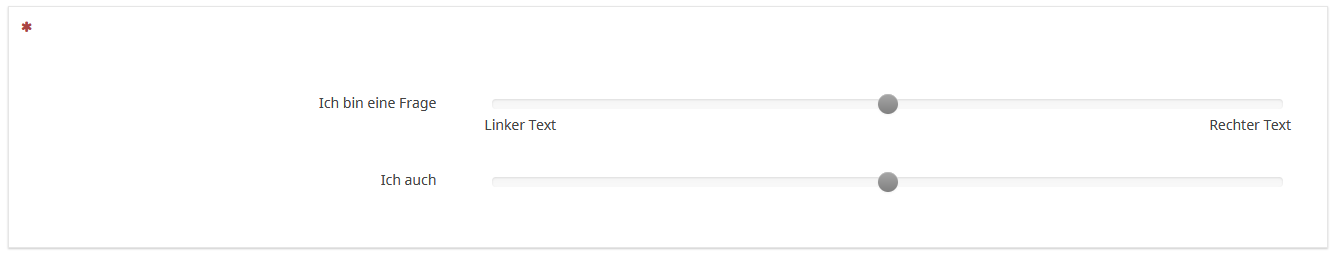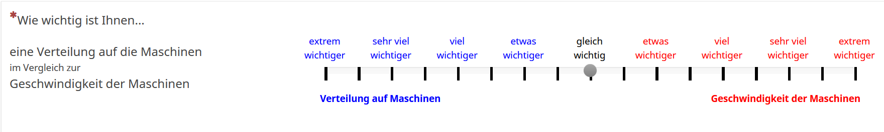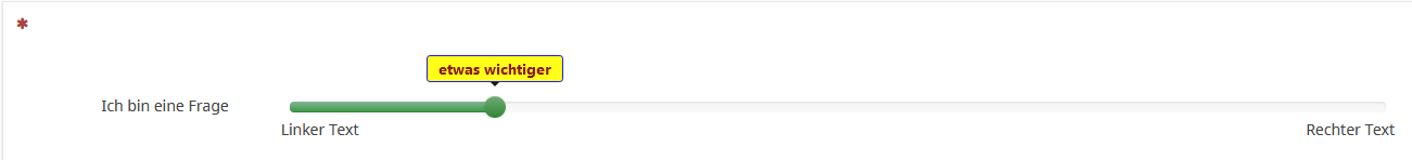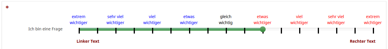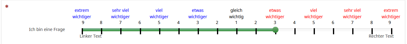 <script type="text/javascript" charset="utf-8"> $(document).on('ready pjax:scriptcomplete',function(){ var ticksArray = [ [1, ''], [2, ''], [3, ''], [4, ''], [5, ''], [6, ''], [7, ''], [8, ''], [9, ''], [10, ''], [11, ''], [12, ''], [13, ''], [14, ''], [15, ''], [16, ''], [17, ''], ]; var ticksArray2 = [ [1, '<span style="color:blue">extrem wichtiger</span>'], [2, ''], [3, '<span style="color:blue">sehr viel wichtiger</span>'], [4, ''], [5, '<span style="color:blue">viel <br> wichtiger</span>'], [6, ''], [7, '<span style="color:blue">etwas <br> wichtiger</span>'], [8, ''], [9, '<span style="color:black">gleich <br> wichtig</span>'], [10, ''], [11, '<span style="color:red">etwas <br> wichtiger</span>'], [12, ''], [13, '<span style="color:red">viel <br> wichtiger</span>'], [14, ''], [15, '<span style="color:red">sehr viel wichtiger</span>'], [16, ''], [17, '<span style="color:red">extrem wichtiger</span>'], ]; insertSliderTicks('{QID}', ticksArray); insertSliderTicks2('{QID}', ticksArray2); }); /* Insert Slider Tick Marks */ function insertSliderTicks(qID, ticksArray) { var thisQuestion = $('#question'+qID); $(thisQuestion).addClass('with-inserted-ticks'); $('input:text', thisQuestion).on('slideEnabled',function(){ var thisSlider = $(this); var thisItem = $(thisSlider).closest('li'); var thisMin = $('.slider-handle:eq(0)', thisItem).attr('aria-valuemin'); var thisMax = $('.slider-handle:eq(0)', thisItem).attr('aria-valuemax'); var thisRange = thisMax - thisMin; $.each(ticksArray, function(i, val) { var tickRelativePosition = val[0] - thisMin; var tickPercent = (tickRelativePosition/thisRange)*100; // Insert tick marks $('.slider-handle:eq(0)', thisItem).before('<div class="inserted-tick left-'+tickPercent+'" style="left: '+tickPercent+'%">\ <div class="tick-text">'+val[1]+'</div>\ </div>'); }); }); } /* Insert Slider Tick Marks */ function insertSliderTicks2(qID, ticksArray2) { var thisQuestion = $('#question'+qID); $(thisQuestion).addClass('with-inserted-ticks'); $('input:text', thisQuestion).on('slideEnabled',function(){ var thisSlider = $(this); var thisItem = $(thisSlider).closest('li'); var thisMin = $('.slider-handle:eq(0)', thisItem).attr('aria-valuemin'); var thisMax = $('.slider-handle:eq(0)', thisItem).attr('aria-valuemax'); var thisRange = thisMax - thisMin; $.each(ticksArray2, function(i, val) { var tickRelativePosition = val[0] - thisMin; var tickPercent = (tickRelativePosition/thisRange)*100; // Insert tick marks $('.slider-handle:eq(0)', thisItem).before('<div class="inserted-tick2 left-'+tickPercent+'" style="left: '+tickPercent+'%">\ <div class="tick-text">'+val[1]+'</div>\ </div>'); }); }); } </script> <style type="text/css">/* Slider Tick Marks */ @media only screen and (min-width: 768px) { .with-inserted-ticks .slider-container { padding-right: 30px; padding-left: 30px; } } .with-inserted-ticks .slider-item { margin-bottom: 100px; margin-top: 100px; } .with-inserted-ticks .slider-container .help-block { margin: 25px 0 0 -20px; width: 40px; text-align: center; } .with-inserted-ticks .slider-container .help-block.pull-right { margin: 25px -20px 0 0; } .inserted-tick, .inserted-tick2 { position: absolute; top: 50%; height: 20px; width: 4px; margin-top: -25px; margin-left: -1px; background-color: #DDDDDD; background-color: black; } .inserted-tick2.left-0, .inserted-tick2.left-100, .inserted-tick.left-0, .inserted-tick.left-100 { background-color: transparent; background-color: black; } .inserted-tick2 .tick-text { position: absolute; top: -250%; width: 100px; margin-left: -50px; color: #000000; text-align: center; } .inserted-tick .tick-text { position: absolute; top: 150%; width: 100px; margin-left: -50px; color: #000000; text-align: center; } @media only screen and (max-width: 768px) { .slider-list .slider-left, .slider-list .slider-right { margin-top: 0em; } } .inserted-tick.left-0 .tick-text { margin-left: 0px; text-align: left; } .inserted-tick.left-100 .tick-text { margin-left: -100px; text-align: right; } } .slider .tooltip { display:none !important; } .tooltip { display:none !important; } .slider-selection { display:none !important; } </style>