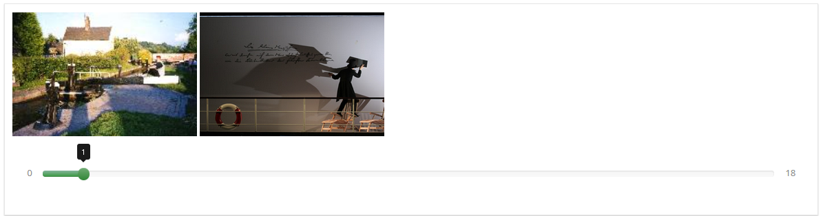 <img alt="" src="https://www.mysurvey.de/userfiles/Boot001_klein.jpg" style="width: 300px; height: 200px;" /> <img alt="" id="pic" src="" style="width: 300px; height: 200px;" /> <script type="text/javascript"> $(document).on('ready pjax:scriptcomplete',function(){ // Identify elements var thisQuestion = $('#question{QID}'); var sliderInput = $('.answer-item.slider-item:eq(0) input:text'); $(sliderInput).on('slideEnabled',function(){ // Listener on slider $(this).on('slide slideStop', function(event) { var x=$(this).val(); //Dies ist nur für das Beispiel nötig; wegen der Namen der Bilder if(x<10) { x='0' + x; } $('#pic').attr('src', 'https://www.mysurvey.de/userfiles/Hamburg-Ballett_'+x+'.jpg'); }); }); }); </script>