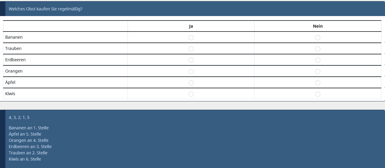 Bei Deinem Obstbeispiel gibt es 720 verschiedene Reihenfolgen. Wie soll dies denn im Datensatz aussehen?