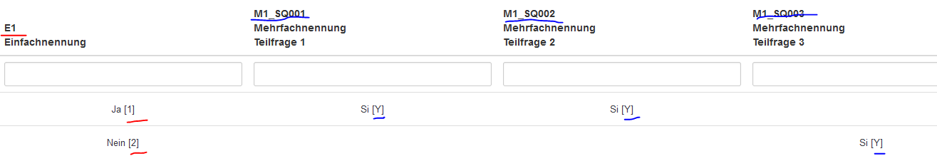 Im Vorgriff: In zweidimensionalen Matrizen (Zahl / Text) werden entsprechend beide Teilfragencodes benutzt (Q1_Y001_X003)