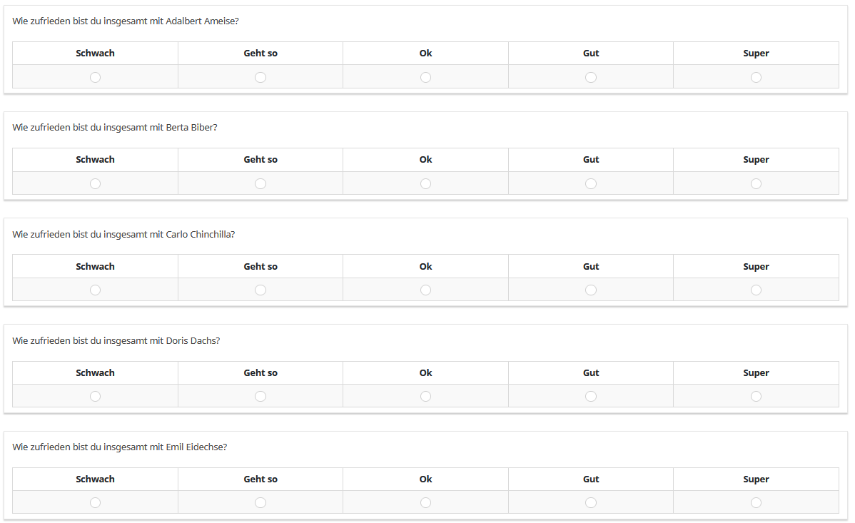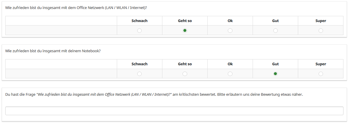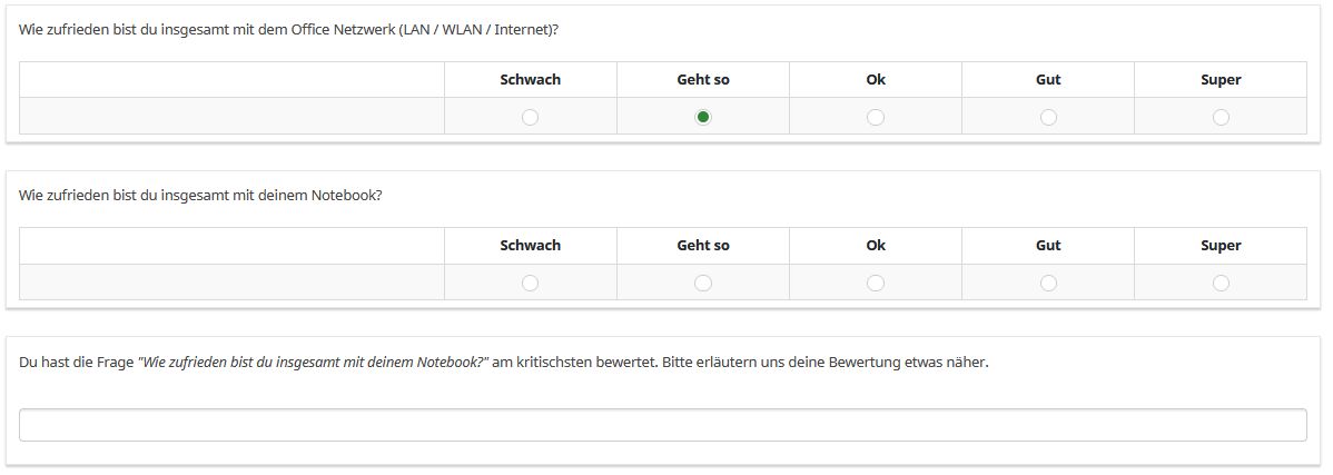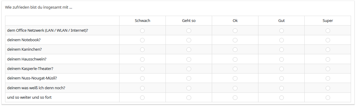 Wirklich? Unter der Teilfrage mit dem niedrigsten Wert?Zusätzlich möchte ich eine Freitextfrage erstellen, die nach Beantwortung aller Fragen unter der Frage mit dem niedrigsten Matrix-Antwortwert auftauchen soll.