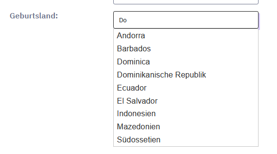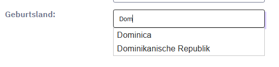 <link href="//code.jquery.com/ui/1.12.1/themes/base/jquery-ui.css" rel="stylesheet" /> <script src="https://code.jquery.com/ui/1.12.1/jquery-ui.js"></script> <script type="text/javascript" charset="utf-8"> $(document).ready(function() { $('#question{QID} input[type="text"]').autocomplete({ minLength: 2, source: ["Afghanistan", "Ägypten", "Albanien", "Algerien", "Andorra", "Angola", "Antigua und Barbuda", "Äquatorialguinea", "Argentinien", "Armenien", "Aserbaidschan", "Äthiopien", "Australien", "Bahamas", "Bahrain", "Bangladesch", "Barbados", "Belgien", "Belize", "Benin", "Bergkarabach", "Bhutan", "Bolivien", "Bosnien und Herzegowina", "Botswana", "Brasilien", "Brunei", "Bulgarien", "Burkina Faso", "Burundi", "Chile", "Volksrepublik China", "Cookinseln", "Costa Rica", "Dänemark", "Deutschland", "Dominica", "Dominikanische Republik", "Dschibuti", "Ecuador", "El Salvador", "Elfenbeinküste", "Eritrea", "Estland", "Fidschi", "Finnland", "Frankreich", "Gabun", "Gambia", "Georgien", "Ghana", "Grenada", "Griechenland", "Guatemala", "Guinea", "Guinea-Bissau", "Guyana", "Haiti", "Honduras", "Indien", "Indonesien", "Irak", "Iran", "Irland", "Island", "Israel", "Italien", "Jamaika", "Japan", "Jemen", "Jordanien", "Kambodscha", "Kamerun", "Kanada", "Kap Verde", "Kasachstan", "Katar", "Kenia", "Kirgisistan", "Kiribati", "Kolumbien", "Komoren", "Kongo, Demokratische Republik", "Kongo, Republik", "Korea, Nord", "Korea, Süd", "Kosovo", "Kuba", "Kuwait", "Laos", "Lesotho", "Lettland", "Libanon", "Liberia", "Libyen", "Liechtenstein", "Luxemburg", "Madagaskar", "Malawi", "Malaysia", "Malediven", "Mali", "Malta", "Marokko", "Marshallinseln", "Mauretanien", "Mauritius", "Mazedonien", "Mexiko", "Mikronesien", "Moldawien", "Monaco", "Mongolei", "Montenegro", "Mosambik", "Myanmar", "Namibia", "Nauru", "Nepal", "Neuseeland", "Nicaragua", "Königreich der Niederlande", "Niger", "Nigeria", "Niue", "Nordzypern", "Norwegen", "Oman", "Österreich", "Osttimor / Timor-Leste", "Pakistan", "Palästina", "Palau", "Panama", "Papua-Neuguinea", "Paraguay", "Peru", "Philippinen", "Polen", "Portugal", "Ruanda", "Rumänien", "Russland", "Salomonen", "Sambia", "Samoa", "San Marino", "São Tomé und Príncipe", "Saudi-Arabien", "Schweden", "Schweiz", "Senegal", "Serbien", "Seychellen", "Sierra Leone", "Simbabwe", "Singapur", "Slowakei", "Somalia", "Somaliland", "Spanien", "Sri Lanka", "St. Kitts und Nevis", "St. Lucia", "St. Vincent und die Grenadinen", "Südafrika", "Sudan", "Südossetien", "Südsudan", "Surinam", "Swasiland", "Syrien", "Tadschikistan", "Taiwan", "Tansania", "Thailand", "Togo", "Tonga", "Transnistrien", "Trinidad und Tobago", "Tschad", "Tschechien", "Tunesien", "Türkei", "Turkmenistan", "Tuvalu", "Uganda", "Ukraine", "Ungarn", "Uruguay", "Usbekistan", "Vanuatu", "Vatikanstadt", "Venezuela", "Vereinigte Arabische Emirate", "Vereinigte Staaten", "Vereinigtes Königreich", "Vietnam", "Weißrussland", "Westsahara", "Zentralafrikanische Republik", "Zypern"] }); }); </script>