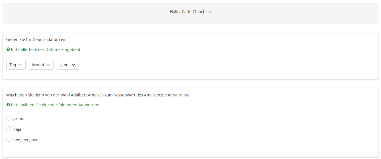 Ich kann leider nicht im Vorfeld sagen, welcher Mitarbeiter über welchen Kanal an der Umfrage teilnimmt.Ansonsten hast du natürlich recht, dann könnte ich eine Attribut in der Teilnehmerliste hinzufügen. Ich habe aber teilweise geschäftliche Mailadressen erhalten, wo die Mitarbeiter den Account für eine AD-Anmeldung gebraucht haben, jedoch nie einen Zugang zu einem Mail-Client bekommen habenAber dann sind diese Teilnehmer ja ebenfalls in der Teilnehmer-Tabelle enthalten; dann kannst Du diesen ja ein zusätzliches Attribut mitgeben, so dass aufgrund dessen die Geburtstagsfrage kommt.