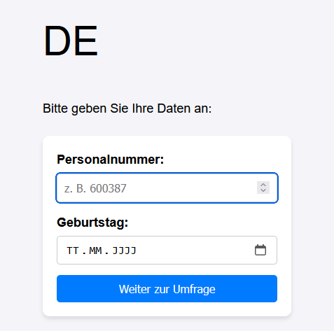--> Zweite Variante, der Zugangsschlüssel ist das Passwort. Ansonsten hätte ich einen Serienbrief oder Art Gutschein für jeden Mitarbeiter erstellen müssen. Daher auch die Personalnummer, die ist erstmal jedem Mitarbeiter bekannt. Bei Tippfehlern ist man aber schnell beim falschen Datensatz, daher die Validierung.Mitarbeiter ohne Mailadresse erhalten via QR-Code den Link zur Startseite mit dem Zugangsschlüssel und geben dort Ihre Personalnummer als Token ein.