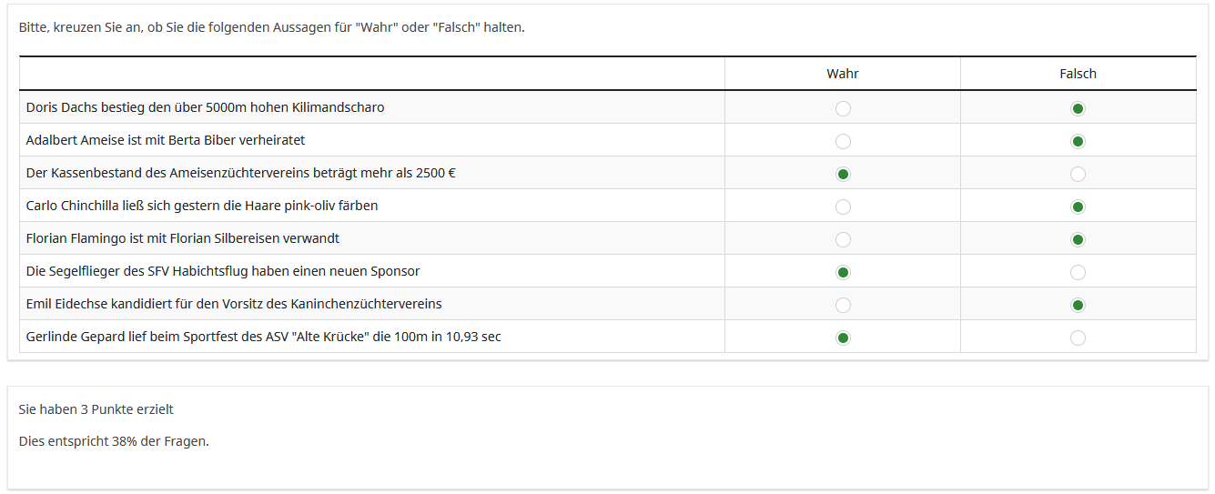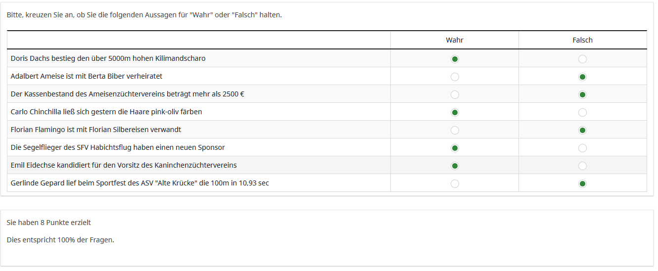 Leider wird nicht die Punkzahl angezeigt, nur die Anzahl von möglichen Punkten, sowie in einer Tabelle die ausgewählte und die richtige Antwortmöglichkeit (siehe bild "auswertung"). {count...} verändert sich mit der anzahl der eingetragenen werte.