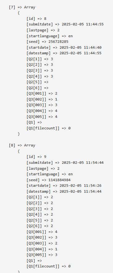 Haben wir also eine "Gleichungsfrage" mit dem Code "eqErgebnis" und schreiben dort die Funktion {6*Q1}, so steht in der Datenbank in der Spalte "eqErgebnis" das Sechsfache der Antwort auf Frage "Q1".