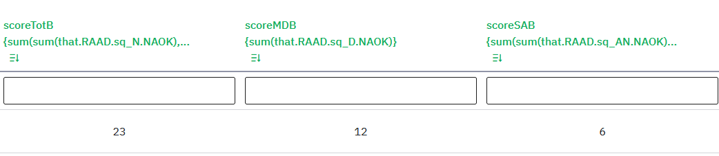 Im ersten Term sum(that.RAAD.sq_N.NAOK) werden alle Items summiert, deren Code ein "N" enthält (sq_N), die "normalen".