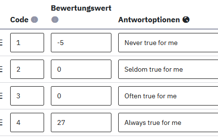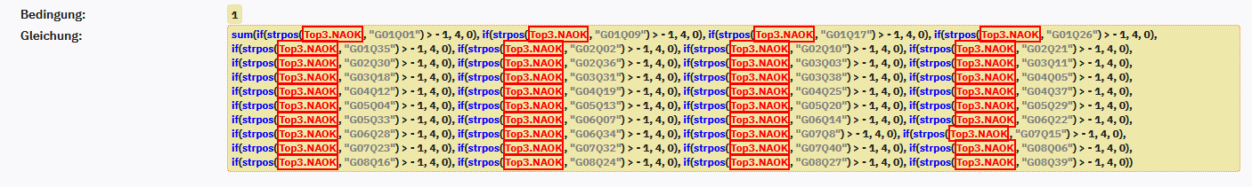 Es wird eine Verkettung der Fragencodes erzeugt, bei denen die Antwort "4" gegeben wurde, nicht die in "MaxPunkte" errechnete Zahl.