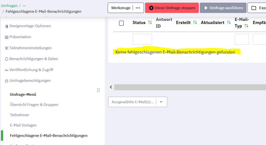 Globale Umfrageeinstellungen habe ich die gleiche sepezielle Emailadresse für Bounce angegeben.