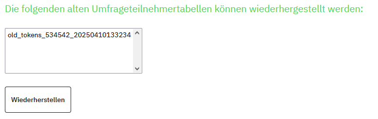 Ich habe es doch beschrieben.Ich kann scheinbar nur neue Fragen hinzufügen, wenn die Befragung deaktiviert ist. Wenn ich das aber machen möchte heißt es, dass die Antworttabelle umbenannt wird und nicht mehr auf die Teilnehmer zugegriffen werden kann.
