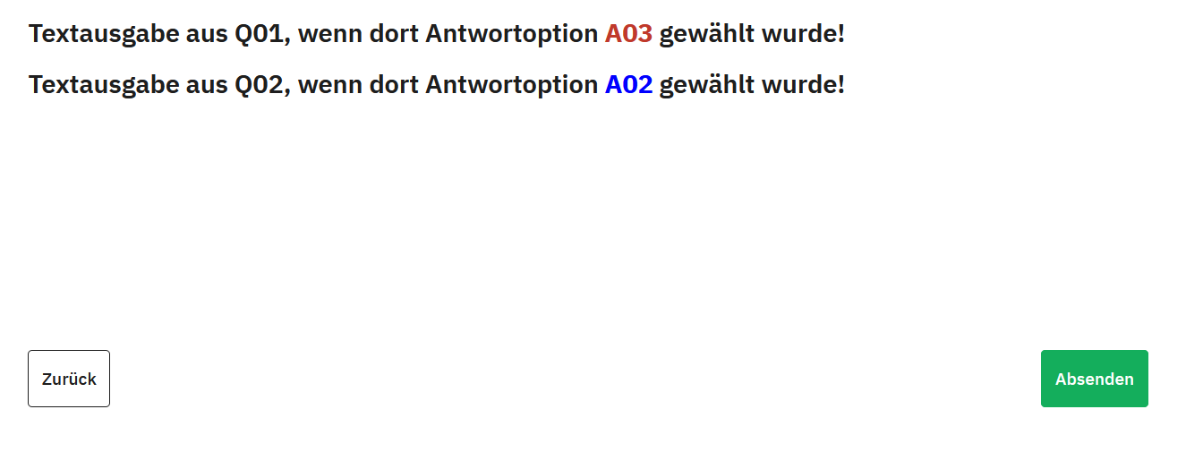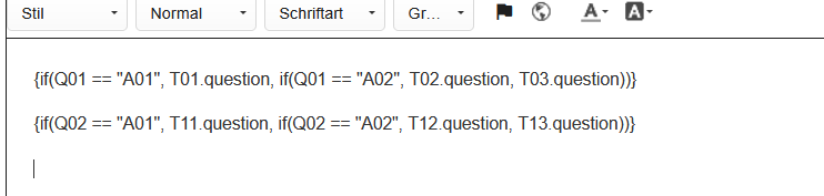 {if(Q01 == "A01", "Text für Antwortoption Q01_A01 aus Quelltext Q02", if(Q01 == "A02", "Text für Antwortoption Q01_A02 aus Quelltext Q02", "Text für Antwortoption Q01_A03 aus Quelltext Q02"))}