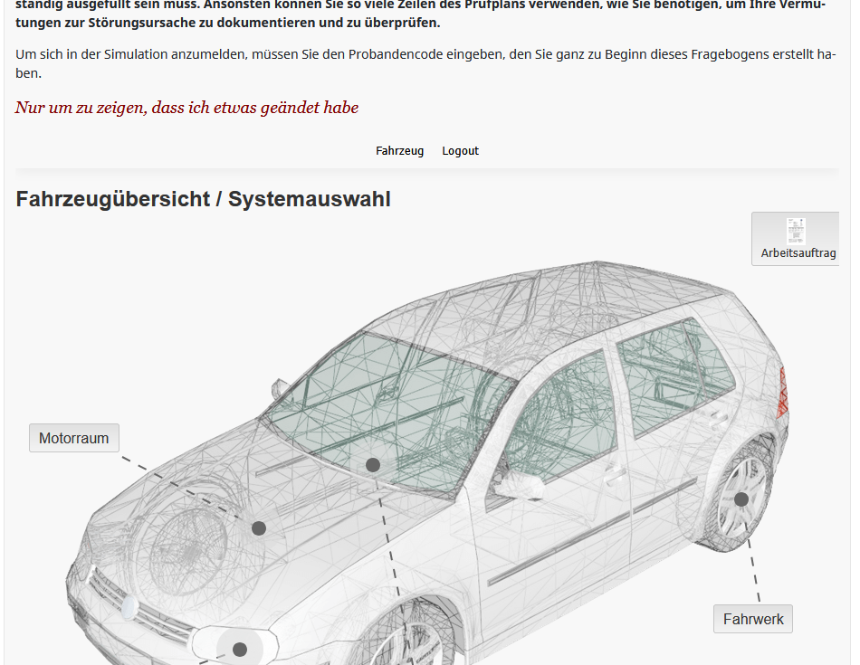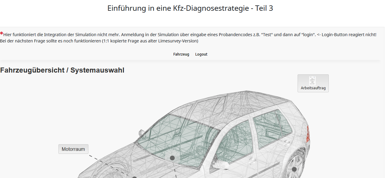 Bestimmte Buttons innerhalb der eingebetteten Simulation (z. B. der „Login“-Button) lassen sich nicht mehr betätigen. Andere Elemente wie der „Probandencode“ oder der „Zurück“-Button funktionieren hingegen wie erwartet (siehe Screenshot im Anhang).