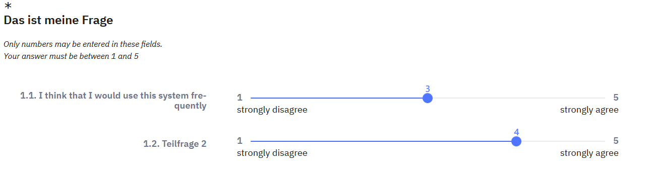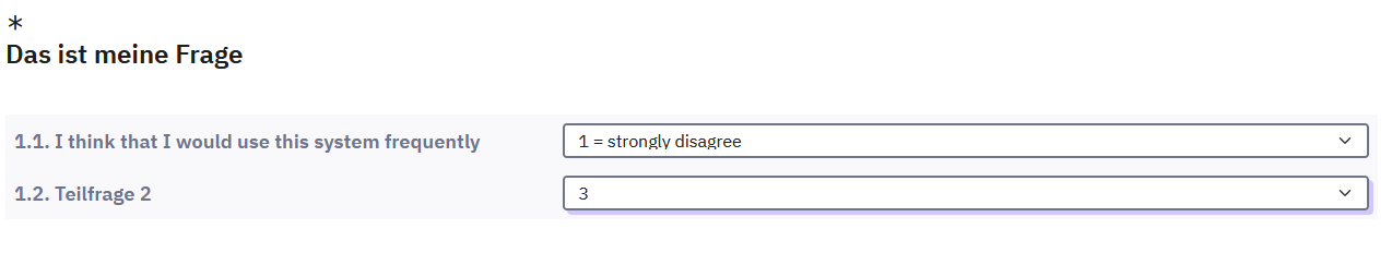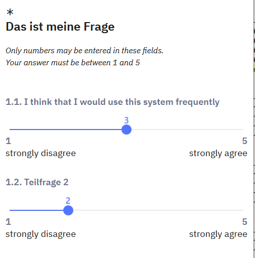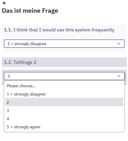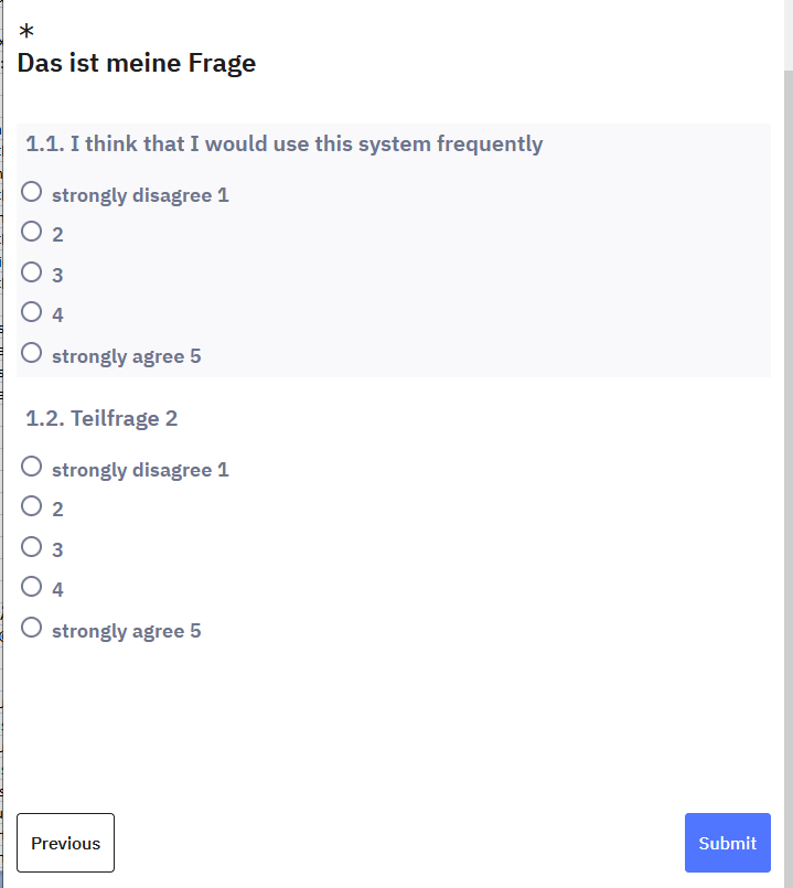 a. list(radio) Da Itembatterien sowieso zu den unbeliebtesten Typen überhaupt gehören, und gerade auf schmalen Devices zu einer Scrollorgie führen, könntest Du auch mehrere "list(radios)" nehmen; dann sieht es auch immer identisch aus. Und Du kannst besser Zwischentexte einfügen, den Teilnehmer zu Atem kommen lassen, ihn ermutigen.