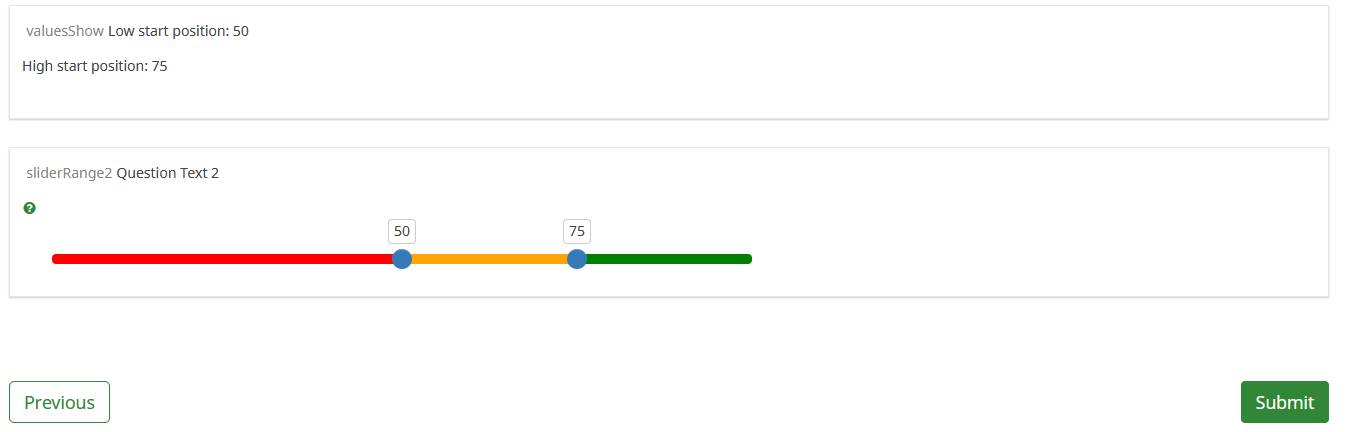 Bei dem Fragetyp gibt es in den Custom Options die Möglichkeit, die 'Low start position' und die 'High start position' einzutragen. Wenn ich hier Werte eintragen funktioniert das super. Ich dachte, ich kann dann hier auch den Wert aus der vorherigen Frage als Variable eintragen. Das wird allerdings immer ignoriert. Ich habe die beiden Fragen extra auf getrennten Seiten angelegt. Der Code für die Frage scheint zu funktionieren, da ich mir die Werte in einer TExtanzeige anzeigen lassen kann.