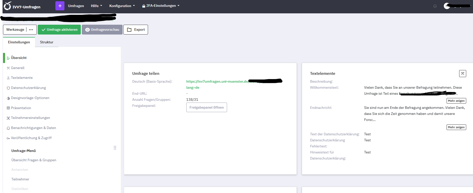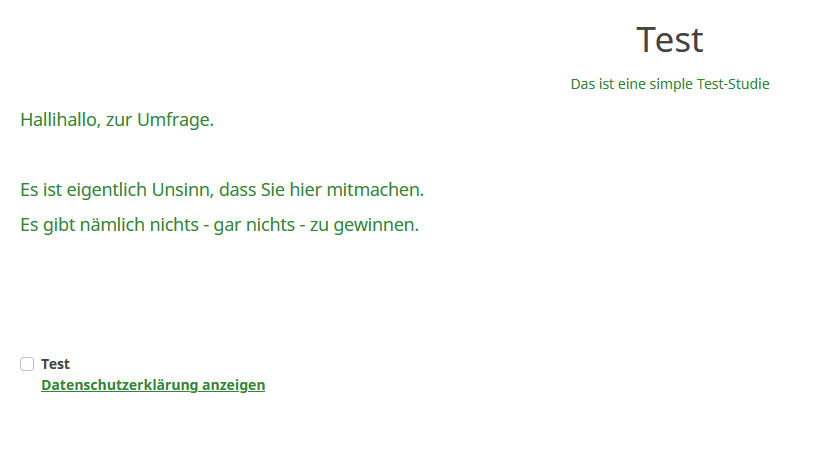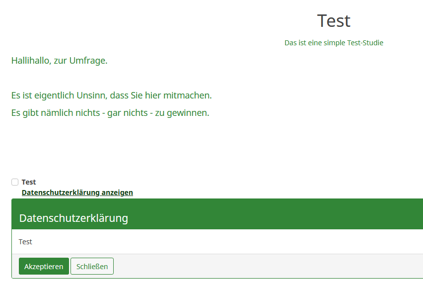 ich bin noch ganz neu dabei und wollte jetzt für eine Umfrage, die ich mit Limesurvey erstellt habe, die Datenschutzerklärung über das Textelement Datenschutzerklärung einfügen. Ich finde hier den klappbaren Text nämlich so praktisch. Leider wird mir in der Umfrage die Datenschutzerklärung nach der Willkommensnachricht jedoch nicht angezeigt. Ich habe es in anderen bereits vorhandenen Umfragen versucht, da hat es leider auch nicht geklappt. Erstelle ich jedoch eine Umfrage neu, kann ich die Datenschutzerklärung auswählen. Ich habe nun als vorläufige Lösung eine eine Frage mit dem Text der Datenschutzerklärung und der Antwortmöglichkeit "Ich willige ein" erstellt. Das geht zur Not auch. Gibt es einen Grund, weshalb man die Datenschutzerklärungsfunktion nicht mehr einfügen kann? Vielleicht gibt es ja eine banale Sache, die ich übersehe.