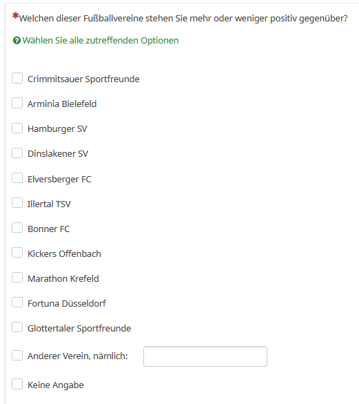 <script type="text/javascript" charset="utf-8"> function shuffle(array) { var currentIndex = array.length, temporaryValue, randomIndex; // While there remain elements to shuffle... while (0 !== currentIndex) { // Pick a remaining element... randomIndex = Math.floor(Math.random() * currentIndex); currentIndex -= 1; // And swap it with the current element. temporaryValue = array[currentIndex]; array[currentIndex] = array[randomIndex]; array[randomIndex] = temporaryValue; } return array; } $(document).on('ready pjax:scriptcomplete',function(){ // Fill the array, hier Zahlen von 1 - 11 var arr = ; for (var i = 1; i < 12; i++) { arr.push(i); } arr = shuffle(arr); arr.push('other'); arr.push('12'); arr1=arr.join(','); $('#question{QID} input[type="text"]').val(arr1); $('#question{QID}').hide(); }); </script>
