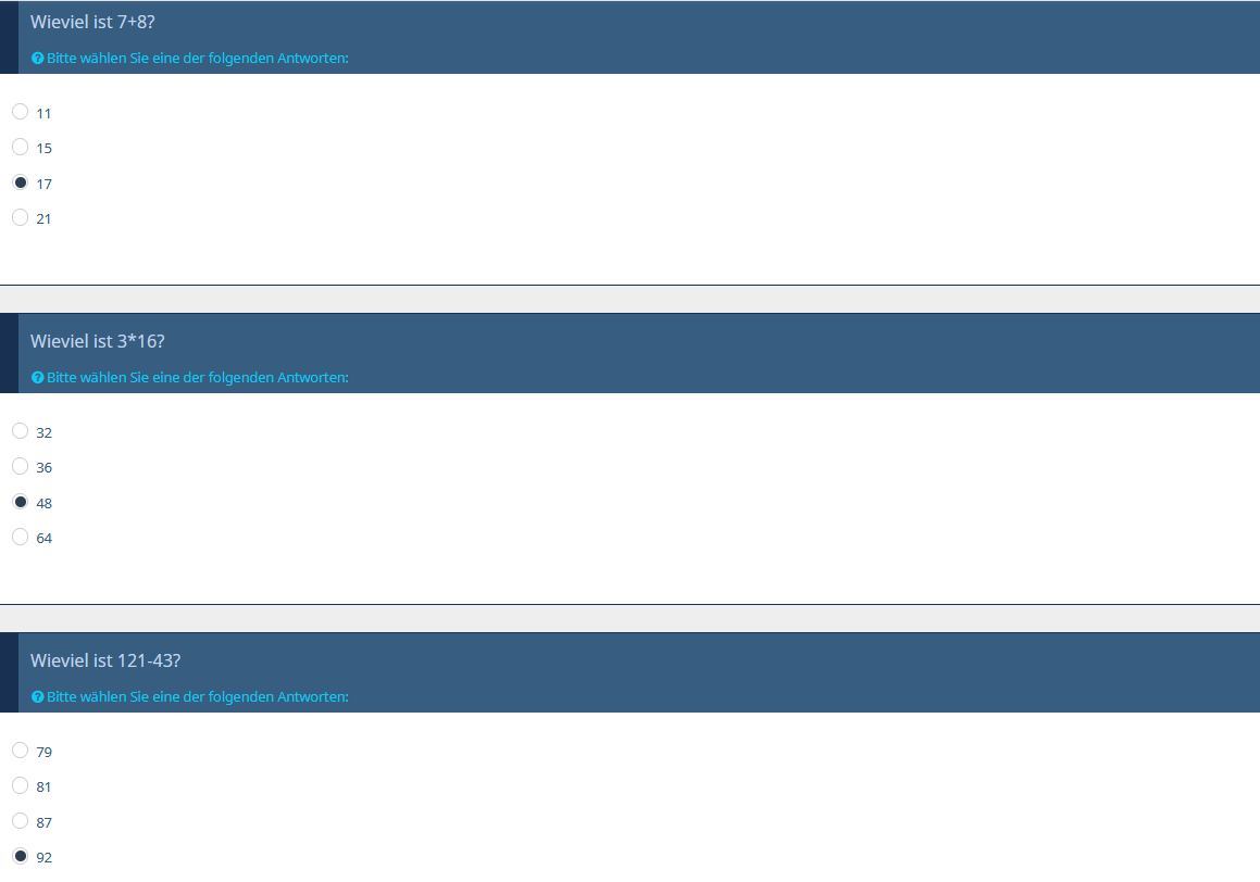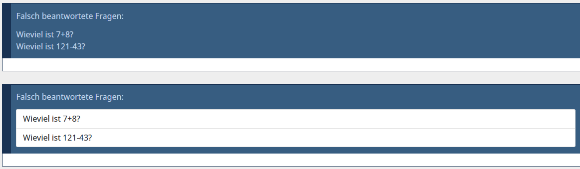 Du siehst übrigens, dass hier umgekehrt gearbeitet wird; wenn die Frage richtig beantwortet wurde, bekommt sie die Klasse "d-none", wird also nicht angezeigt.
