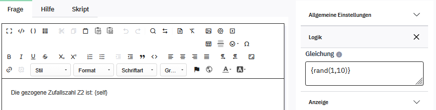Wenn man eine Equation in den Fragetext der Frage Q1 schreibt - wie {rand(1,6)} - um dann später Fragen nur anzuzeigen, wenn Q1==1 oder Q1==2 ist, muss man darauf achten, dass keine zusätzlichen Zeichen dort hineingeraten. Denn dies wird alles mitgespeichert.Zuerst hatte die Frage "Chaturl" gar keinen Inhalt für mich. Fand die Formel dann unter dem Feld "Equation". Um ehrlich zu sein, ich habe keine Ahnung für was dieses Feld da ist.