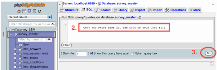 The following process will restore your previous database: I assume that you want to recreate 100% of your previous installation, not only reimport this specific survey with related submitted responses. (If not you have to change somehow this method, for example if you have change admin/users credentials in your new platform and don't want to overwrite this with data of your old platform)...