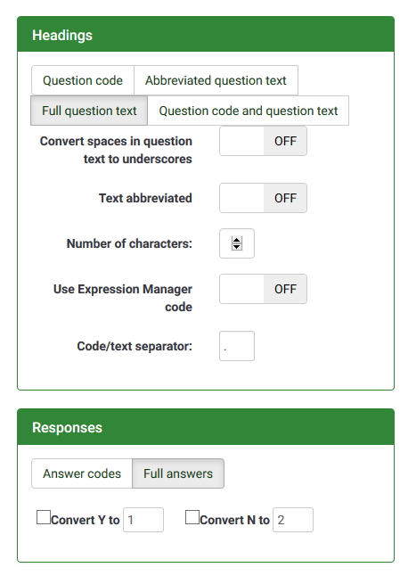 After upgrading to this version I (and my users) noticed that when we export the results, the question itself doesn't show up in the header of the CSV export. The value of the question number e.g. A110[1] A110[1comment] A110[2] A110[2comment] shows up rather than the question itself (even though I choose that type of export from the menu on the left-See screenshot below).