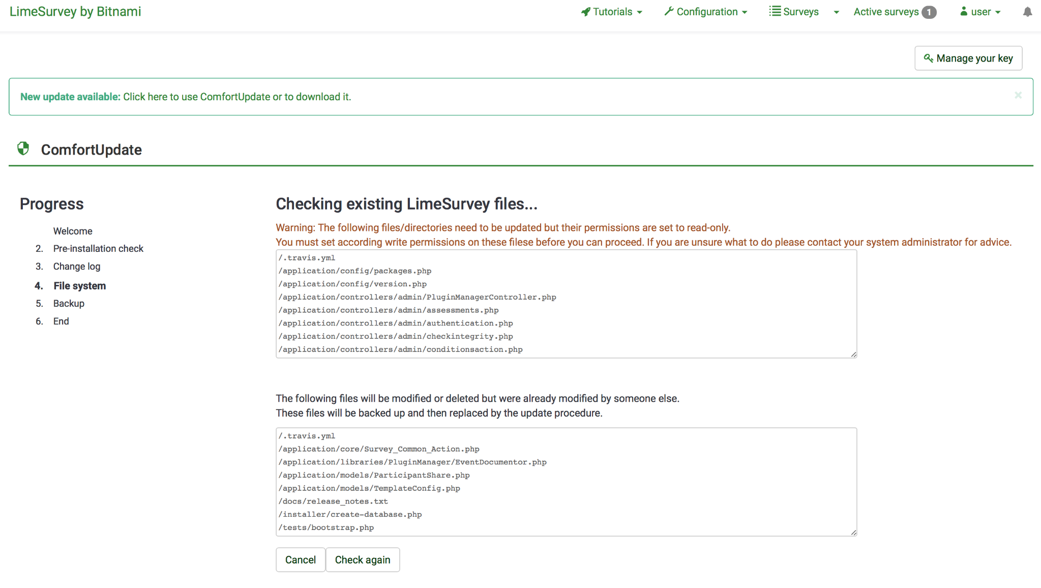 Checking existing LimeSurvey files... Warning: The following files/directories need to be updated but their permissions are set to read-only.