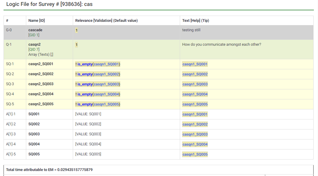 Version 3.5.3, I am using the online installation offered by LimeSurvey. buy the cells on the x axis keeps appearing when they have not been added yet . i suspect it may be an issue with the equation for relevance or something but just cannot get it to work .. i really need help with this. i am going to attach a question group and an image of the logic.