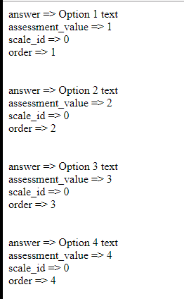 <?php require_once 'jsonRPCClient.php'; define( 'LS_BASEURL', 'https://pathTo/limeSurvey'); define( 'LS_USER', 'admin' ); define( 'LS_PASSWORD', 'password' ); $iQuestionID = 123; if(ctype_alnum($iQuestionID)) { // Valid QID format // Instantiate a new RPC client $myJSONRPCClient = new jsonRPCClient( LS_BASEURL.'/index.php/admin/remotecontrol' ); // Get a session key $sSessionKey= $myJSONRPCClient->get_session_key( LS_USER, LS_PASSWORD ); if(is_array($sSessionKey)) { // Invalid session echo $sSessionKey['status']; } else if($sSessionKey) { // Valid session $questionProperties = $myJSONRPCClient->get_question_properties($sSessionKey, $iQuestionID); foreach($questionProperties['answeroptions'] as $key => $value) { foreach($value as $key => $value) { echo $key . ' => ' . $value . '<br />'; } echo '<br /><br />'; } } // Release the session key $myJSONRPCClient->release_session_key( $sSessionKey ); } else { // Invalid SID format die( 'Invalid format!' ); } ?>