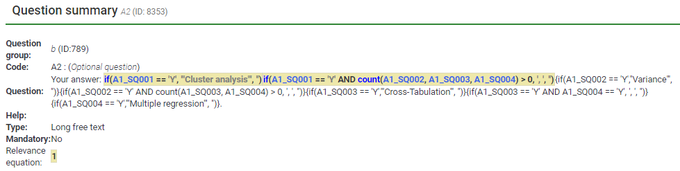 I attached the survey for this question below.{if(A1_SQ001 == 'Y','"Cluster analysis"', '')}{if(A1_SQ001 == 'Y' AND count(A1_SQ002, A1_SQ003, A1_SQ004) gt 0, ', ', '')}{if(A1_SQ002 == 'Y','"Variance"', '')}{if(A1_SQ002 == 'Y' AND count(A1_SQ003, A1_SQ004) gt 0, ', ', '')}{if(A1_SQ003 == 'Y','"Cross-Tabulation"', '')}{if(A1_SQ003 == 'Y' AND A1_SQ004 == 'Y', ', ', '')}{if(A1_SQ004 == 'Y','"Multiple regression"', '')}