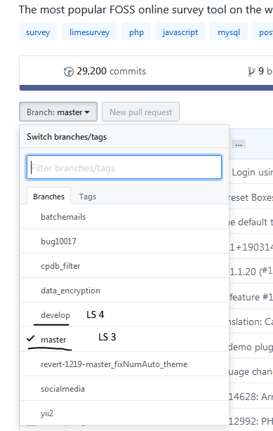 The GITHUB of LimeSurvey GmbH is offering LS3 and LS4 as branches. The older branches were taken over by Denis.hvgard wrote: Version 2.x needs to be supported for many years (at least 3 preferably 5) to come. Even if there will be a 3.x LTS.