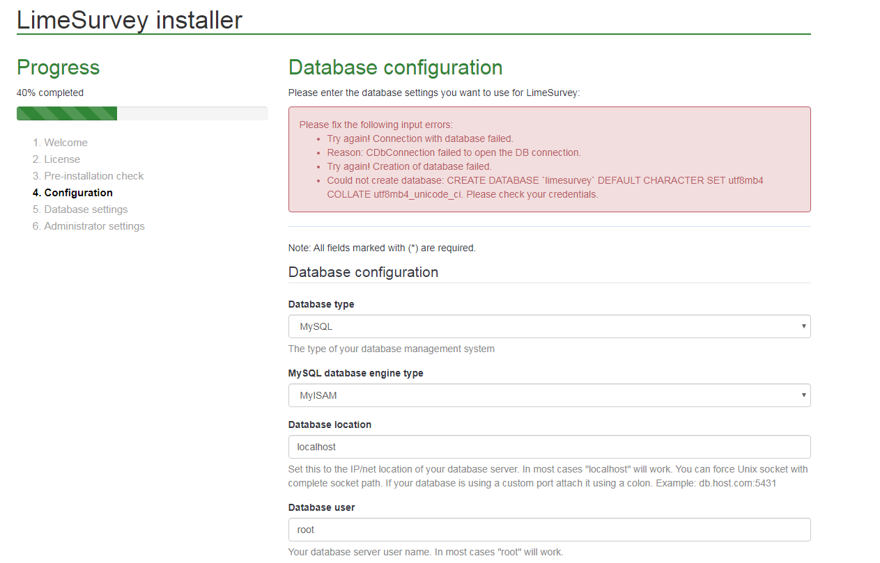 Could not create database: CREATE DATABASE `limesurvey` DEFAULT CHARACTER SET utf8mb4 COLLATE
