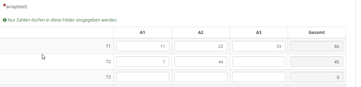 Actually the question would be how can I insert on that field (total for row) when somebody type a number on other rows to be inserted and calculated total for my total field. Just like Array of text with total option. I mention that I tried the Array of text but is loading verry hard so would not be an solution for me.